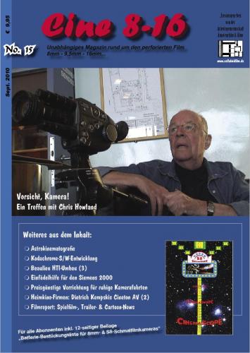 19. ...u. a. mit folgenden Themen: + CineWorld: Neues vom Schmalfilm- & Zubehörmarkt, Veranstaltungshinweise, etc. + Filmwelt: Jörg Polzfuß über "Kodachrome-Labore" + Background: Kodachrome selbst als Schwarzweiß-Negativ entwickeln + Vorsicht, Kamera! Ein Treffen mit dem Schauspieler Chris Howland + Filmszene: Von Hirsch-Trophäen und Super-8-Filmen: Zu Besuch auf dem 34. Filmfest in Weiterstadt + Astrokinematografie: Mit Super 8 und 16mm unter dem Sternenhimmel Namibias + Pfiffig: Batterieadapter für Belichtungsmesser von NIZO-Kameras + Selbst gebaut: Preisgünstige Vorrichtung für ruhige Kamerafahrten + Kristallbildung - Befall von gelagerten Super-8-Umkehrkopien + (K)ein Einzelstück? - Siemens 2000 mit Einfädelsystem + Let’s talk about Microphones (1): Dipl.-Ing. Horst Zarm entführt uns in die Welt der Mikrofone + Erinnerungen an das Pötter-Zweibandsystem + Beaulieu-HTI-Umbau, 3. Teil: Manfred Neumann und Rainer Feilen über die "Abschlussarbeiten und Verbesserungen" + Von Cineton AV Electronic zur Scoptimax GmbH (2): Eberhard Nuffer mit weiteren Details über die CinemaScope-Schmiede von Dietrich Kemspki + Filmreport: 10 Seiten mit Neuerscheinungen (neue Trailer, Cartoons + ein neuer Spielfilm-Klassiker via Import!) + “Superheroes & Myths”: neue CinemaScope-Rolle auf Super 8 von L.A. Films, USA + Filmbibliothek: Totenkopf & weiße Segel - Lexikon des klassischen Piratenfilms + Leser- & Kleinanzeigenforum + "Cine 8-16" Special: Kostenlose 12-seitige Extraheft-Beilage: „Batterie-Bestückungsliste für 8mm- & Super-8-Schmalfilmkameras“ nur für unsere Abonnenten Hinweis: "Cine 8/16" ist trotz professioneller Aufmachung (DIN A4, farbiger Offset-Druck, Hochglanzpapier) keine kommerzielle Publikation, sondern erscheint als Informationszeitschrift der Arbeitsgemeinschaft Amateurfilm & Kino sowie der Arbeits- und Interessengemeinschaft Celluloidfilm und wird zum Selbstkostenpreis abgegeben. Alle Autoren, Fachautoren und sonstige Mitwirkende arbeiten unentgeltlich im Dienste des Hobbys um den perforierten Film. Kontaktadressen finden Sie auf unserer Webseite www.celluloidfilm.de.