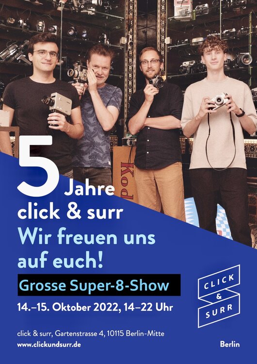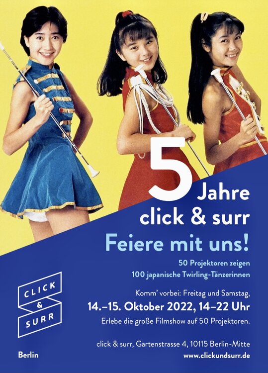 Liebe Schmalfilfilm-Freunde, das Berliner Fachgeschäft für analoge Film- und Fototechnik, click & surr, existiert Mitte Oktober 2022 schon 5 Jahre. Wer hätte das gedacht? Aus diesem Grund laden wir Kunden und solche, die es in den nächsten 5 Jahren noch werden könnten, zu einer großen Super-8-Show mit 50 Projektoren ein. 100 japanische Twirling-Tänzerinnen werden auf privaten Filmen aus den 1970er Jahren zu bewundern sein: wie sie üben, performen oder auch mal versagen... Lasst euch die amüsante Show nicht entgehen. Am Freitag, 14. Oktober, und am Samstag, 15. Oktober, jeweils von 14.00-22.00. Treffpunkt ist der Laden in der Gartenstrasse 4, 10115 Berlin-Mitte. Von dort aus geht es dann einige Schritte weiter, denn unser Fachgeschäft bietet leider nicht genug Platz für 100 Tänzerinnen, geschweige denn für 50 Projektoren. Aber auch im Laden gibt es zum Jubiläum einige Sensatiönchen zu bestaunen. Wir freuen uns auf euch! Die Feier für geladene Gäste & Geschäftspartner findet am Freitag, 14. Oktober, um 18 Uhr statt.