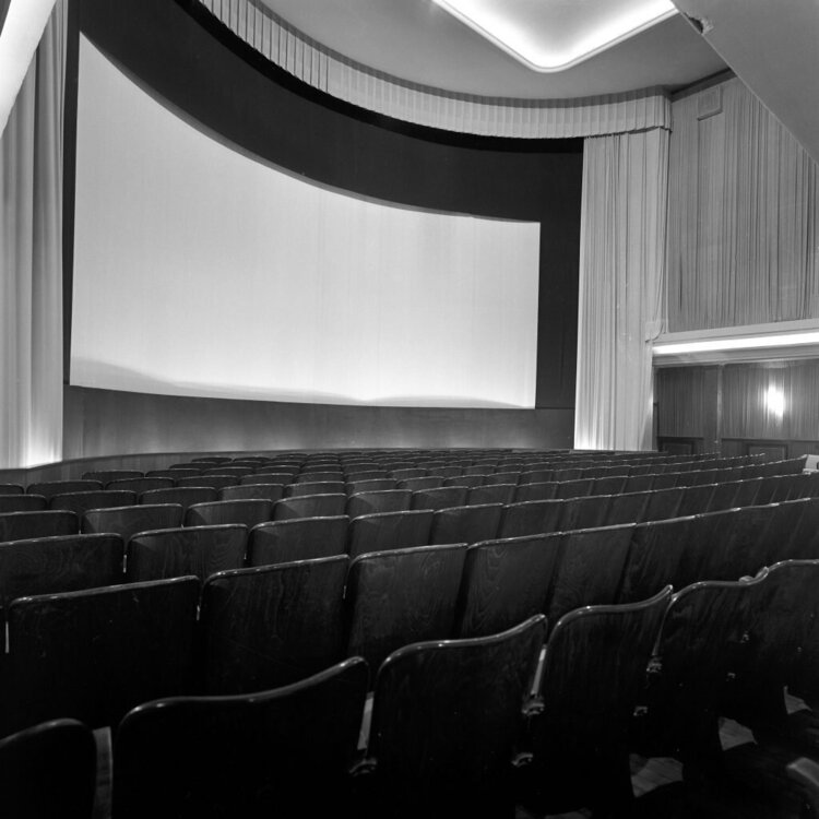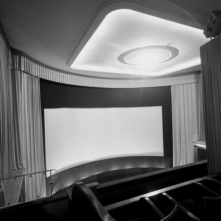 3. Weiß jemand zufällig, wie im Gloria-Palast auf der 13 x 6,10 m großen Leinwand Filmformate wie z.B. von FANTASIA (1:1,33) behandelt wurden? Wurde die Leinwand dazu an den Seiten maskiert? Oder war das o.g. Maß (1:2,13) das maximale Breitwandformat, so dass eine Maske noch etwas mehr zusätzliche Höhe der Leinwand verdeckte? Fast scheint es mir anhand der Fotos so, als sei nach oben hin noch "Luft". Ich kann mir kaum vorstellen, dass man soviel Bild oben und unten abgeschnitten hätte. Fotos: Wilhelm Hauschild (www.filmundgeschichte.com)