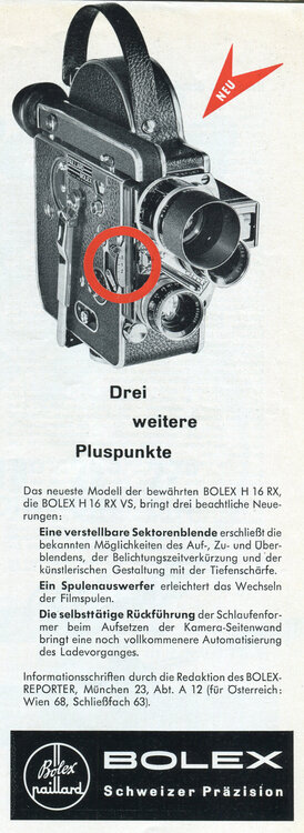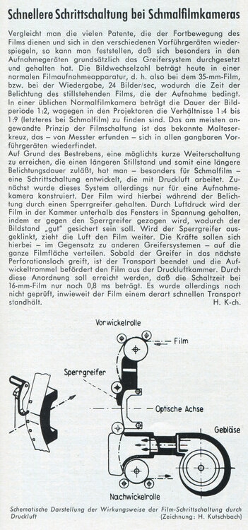 Interessanter finde ich da schon diesen Mini-Artikel aus dem Jahr 1957, über den ich gerade gestolpert bin: Es wird ein neuartiger und vermutlich nie verwirklichter (?) Filmantrieb für Schmalfilmkameras beschrieben. (Quelle: Film-Technikum 2/1957)