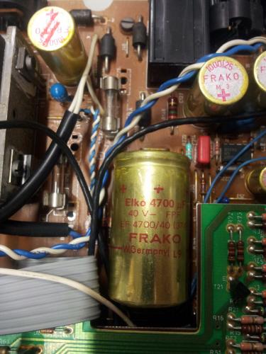 So sieht der Siebelko im Eumig S940 aus: 4700 Mikrofarad, 40 Volt, liegende Bauform. Die vier schwarzen Bauteile oberhalb sind die Gleichrichterdioden. Aktuelle Kondensatoren mit diesen Werten sind wesentlich kleiner und werden meistens stehend eingebaut. Aber das bekommt man hin. Wie schon gesagt: Ich würde die Ursache für das Brummen erstmal woanders suchen. Meistens halten sich die Elkos im Netzteil sehr gut, oder sie geben völlig auf und die Sicherung fliegt. Wenn der Kondensator auch optisch gut aussieht (kein "aufgeblähtes" Gehäuse an der "plus" Seite, kein ausgetretenes Elektrolyt), würde ich ihn auch nicht ersetzen. Letzte Sicherheit schafft natürlich nur die Kapazitätsmessung. Jörg -