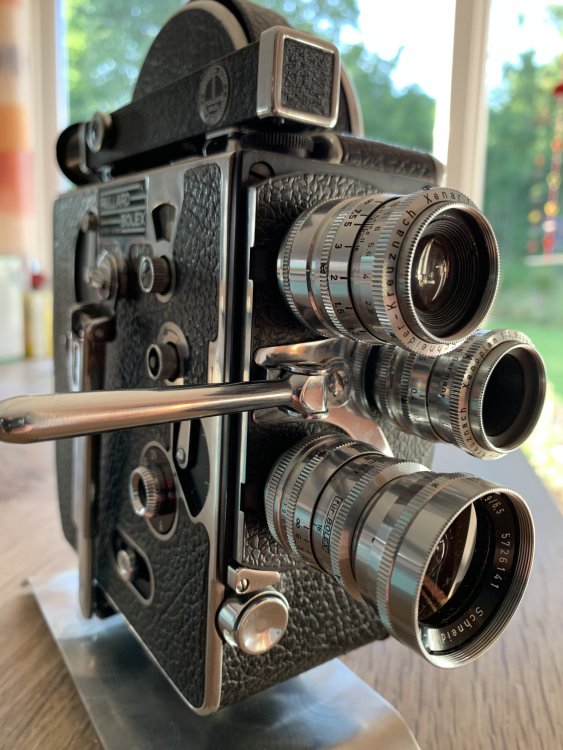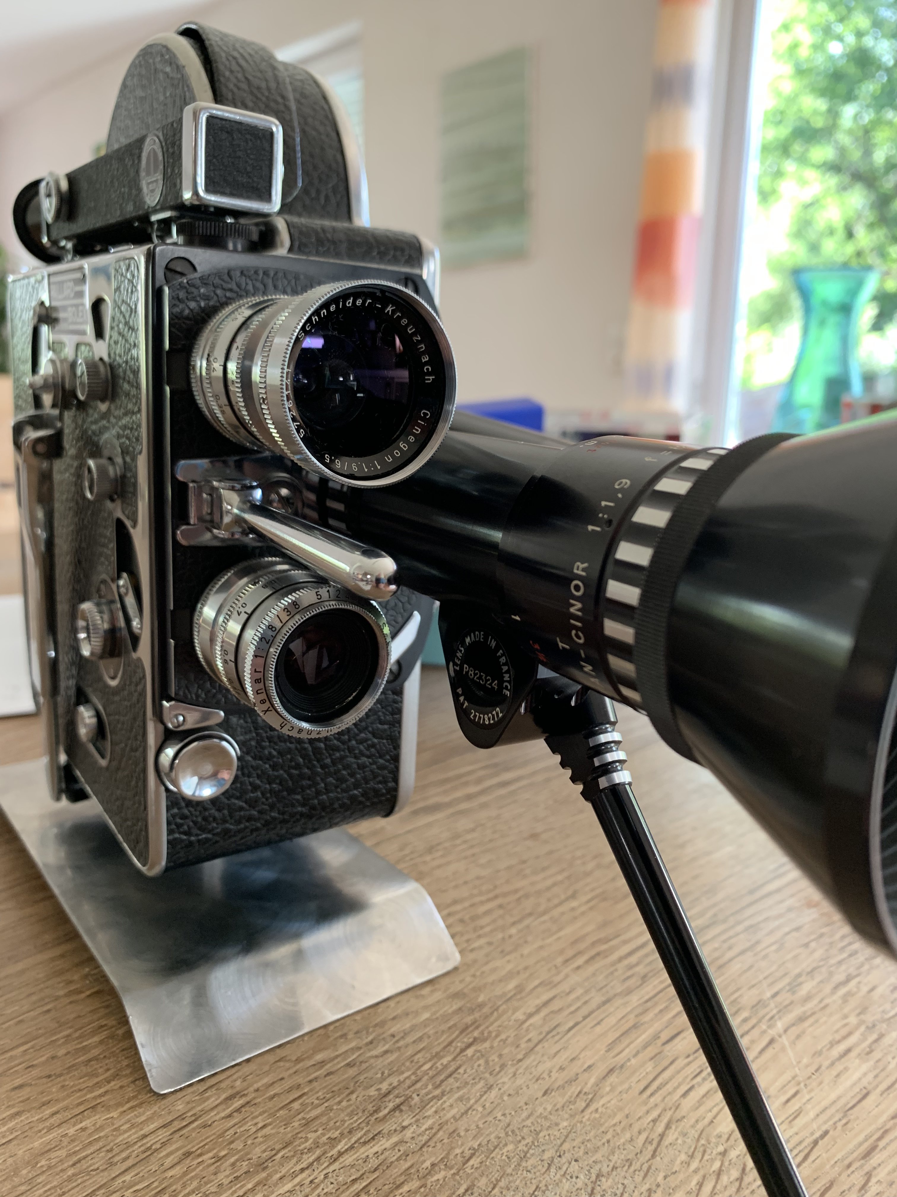 Montiert sind ein 6,5 Schneider Cinegon, ein 38 schneider Xenar (das habe ich auch an der Bolex B8L) und ein Som Berthiot 8-40 Zoom. Nun habe ich drei Sucher und nur zwei Augen! Simon, hilf! Gruss Uwe