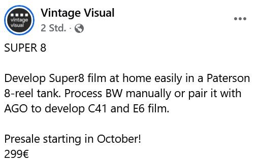 jetzt auf der Firmen-Homepage und bestellbar: https://www.vintagevisual.eu/product/reel-super-8/?fbclid=IwY2xjawNZxpJleHRuA2FlbQIxMQABHsWUgHti3Iw4mut4Wm2icz-z8jyDeL9EE1DX2grb-xb0Nq0s5whkY97To4A7_aem_8GpH_YSuOjrcJQtay5-y4Q (man benötigt natürlich noch den entsprechenden Paterson-Fototank dazu) -