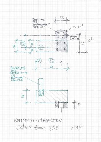 Guten Abend liebe Forenten! Seit geraumer Zeit habe ich ein Kompendium einer Bauer A512 herumliegen, welches hinsichtlich Objektivdurchmesser optimal auf meine Canon Zoom DS8 passen würde. Nun hat meine Canon eine angeformte Halterung, die wohl grundsätzlich für die Aufnahme solcher Zubehörteile gedacht ist: Ich habe mir nun eine Zwischenhalterung überlegt, mit der es möglich wäre, das Kompendium an der Canon zu befestigen: Der Bolzen des grün dargestellten Teils wird in der Kamera-Halterung befestigt. Die Bohrung im schwarz dargestellten Teil nimmt die Haltestange des Kompendiums auf. Wer hier im Forum hat evtl. die Möglichkeit dieses Teil anzufertigen ?