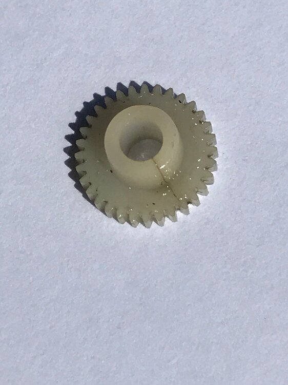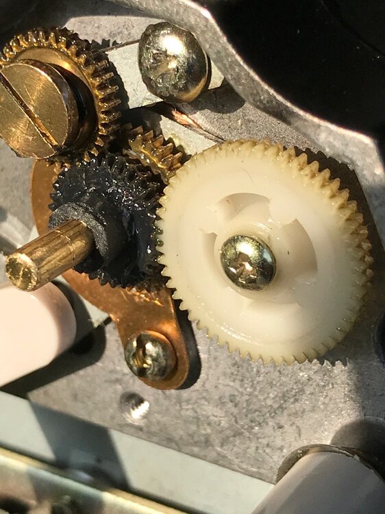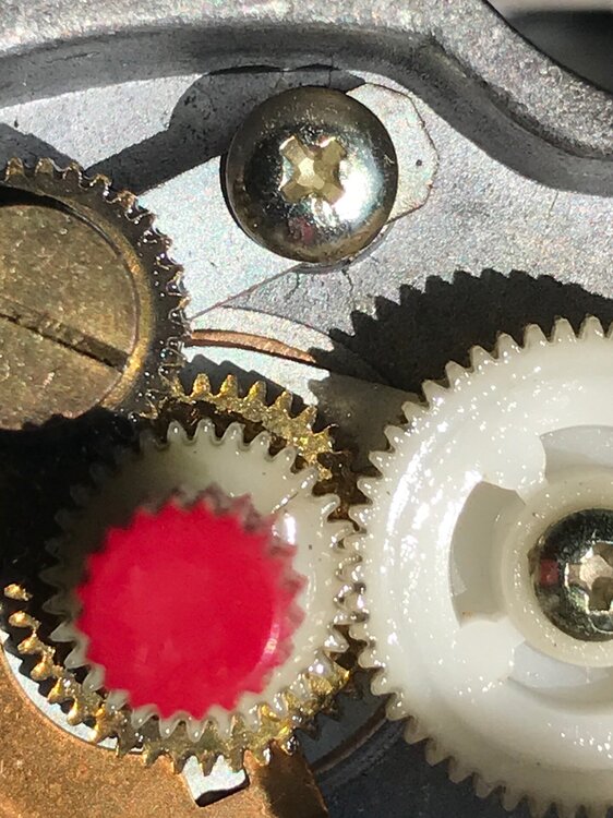 Vorne demontieren: Schöne Abdeckung: Alle Knöpfe abziehen, 3 winzige Schrauben ( eine unter Editing ) und dünne Mutter bei Kopfhörerbuchse lösen, unter "Editing" ist diese Platte noch mit doppelseitigem Klebeband innen festgeklebt. 2. Abdeckung: 4 hineinversetzte Schrauben, den roten Knopf mit Zange abziehen Vorsicht beim Aufsetzen des neuen Zahnrades: Wieder abziehen und neu versuchen, bis sich das Zahnrad leichter aufstecken lässt. Ganz brachte ich es nicht auf die Achse. Die Achse hat Rillen, die aber nicht bis ganz hinten gehen. So vergrößerte ich beim Ersatzteil das Loch (nur hinten ein ganz kleines Stück) um 0,5 mm, baute den ganzen Block mit dem Prisma aus ( 2 Schrauben ) aus und konnte das neue Zahnrad ganz auf die Achse bringen ( beim Prisma etwas untergelegt ). Foto1 und 2: das alte Zahnrad mit Riss Foto3: Zahnräder von Van Eck Foto4: Neues Zahnrad, mit der Schraube oben Mitte kann man das Zahnrad links daneben einstellen. Viel Spaß bei der Reparatur