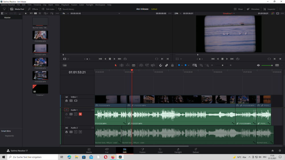 Ich bin jetzt auf DaVinci Resolve umgestiegen. Ein ausgezeichnetes Videoschnittprogramm für vertonte Filme. Audio1 ist Ton von der digitalen Aufnahmekamera (mit Projektor-Geräusch), Audio2 der bessere Ton, extern aufgenommen im Programm Audacity im Computer über Line in. Die Audiospur2 kann man punktgenau zur Tonspur Audio1 nachstellen, dass der Ton im Film dann nicht verschoben ist. Man kann auch Audio1 und Audio2 gleichzeitig hören. Die Tonspur Audio2 bleibt während des ganzen Videos synchron zu Audio1, was man im Bild sieht. Fürs Rendern zum Schluss stelle ich Audio1 natürlich stumm (M). Man könnte Audio1 auch löschen.