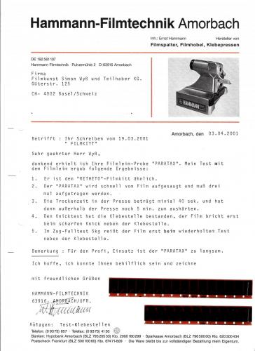 Habe ein fünfzehnjähriges Schreiben gefunden und eingelesen: PARATAX ist bei mir erhältlich. 10 ml in PE-Fläschlein kosten 9 Franken, 250 ml in Glasflasche mit Schliffstopfen kosten 40 Franken, zuzüglich Versand. PARATAX ist ungiftig, dickt nicht ein und bindet langsam ab. Ideal für älteres Filmmaterial und Restaurierungsarbeit