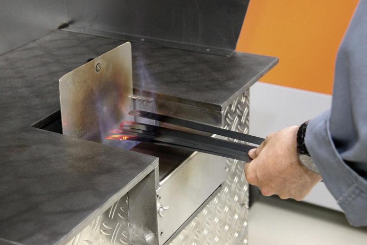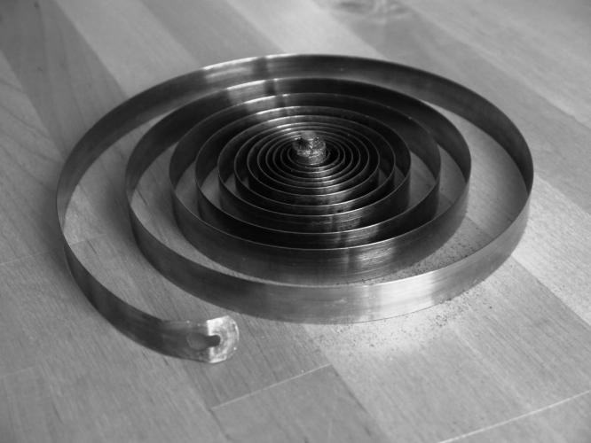 Nachtrag Breite 14,64 mm; Höhe 0,5 mm; Kanten rundgeschliffen. Der Einhängebolzen in der Federbüchse ist außen gut verschliffen. Unter dem Schlüssel liegt ein vorgeformter Bronzering als Feder. Die Kappe mit den fünf konzentrischen Ringen ist im Innern mit der Büchse verschränkt, um die Einheit auseinandernehmen zu können, muß man den Bronzering heraushebeln. Wenn er ge- brochen ist, fällt er bei Zerlegung bis hierhin von selbst heraus. Diese Feder ist einen Zehntel breiter als die der Paillard-Bolex H-16, Nr. 10005. Made in Germany bedeutet wohl, daß eine Federnfabrik im Schwarzwald Lieferantin war. Dort war das Zentrum der Uhrmacherei und der Feinwerktechnik. Hier ein Bild von der Webseite der Firma Haller-Jauch in Villingen-Schwenningen: Federenden werden angelassen, das ist Erwärmen, Halten auf einer Temperatur von etwa 300 bis 350 Grad und langsames Abkühlen, um die Härte zurückzunehmen. Ließe man den Stahl federhart, würde er am Einhängeauge leichter brechen. Warum hier auf hellrot geglüht wird, verstehe ich nicht recht. Das kann so viel Kohlenstoff heraustreiben, daß jegliche Spannkraft verloren geht. Vielleicht bestehen die abgebildeten Streifen aus legiertem Stahl. -