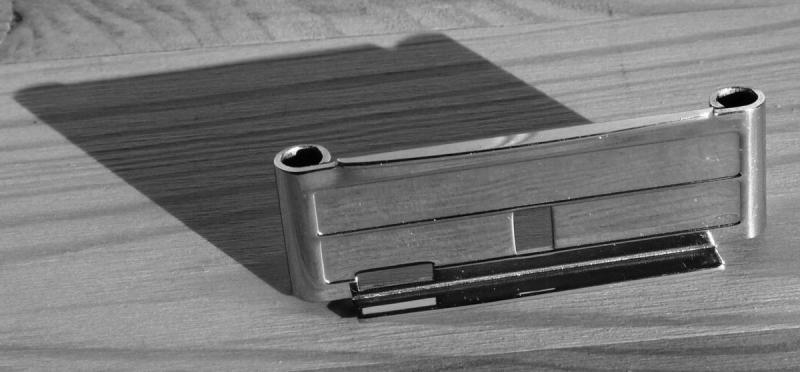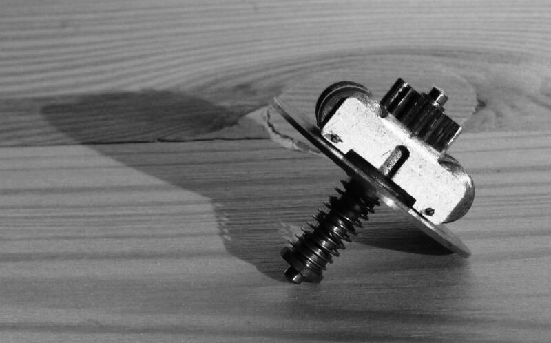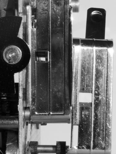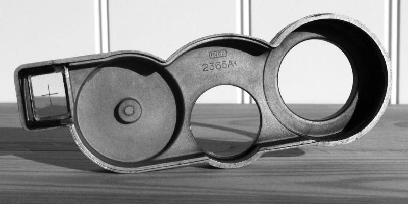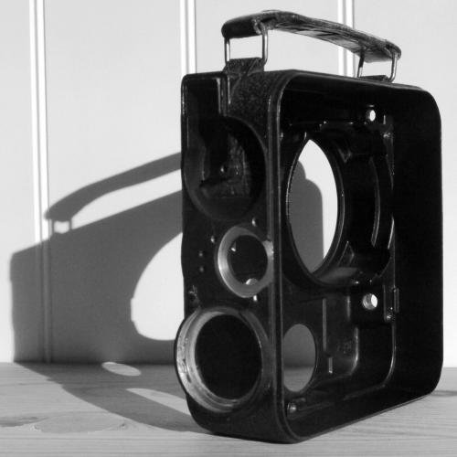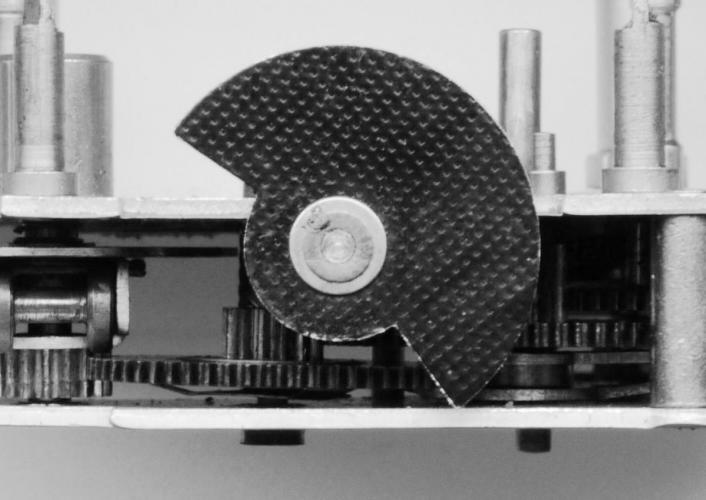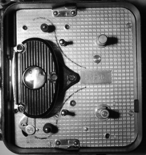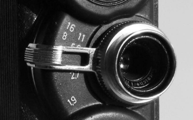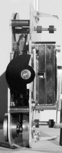 Sieht sie nicht furchtbar altmodisch aus? Die Eumig C3 als meistverkaufte Filmkamera überhaupt ist wahrlich ein Oldtimer, der aber noch heute seinen Charme wirksam anbringt durch die anscheinend quadratische Form des gerippten Gehäuses, durch Schlankheit und durch Einfachheit. Man kann nur aufziehen und auslösen, Filmkamera, nichts anderes. Doch es ist nicht so. Das Gehäuse ist nicht quadratisch und es stecken da ein paar Dinge drin, die ich nun nach über 78 Jahren ans Tageslicht bringen will. Kommt mit zu den Geheimnissen der C3! Wer hat sie nicht schon in Händen gehabt? 4⅝ Zoll (117,5mm) hoch, 4¼ Zoll (108mm) lang, 1¾ Zoll (44,5mm) breit (jeweils minus Schwindmaß), ein gutes Kilo schwer. Der blitzende Aufzugschlüssel lockt, der kleine Suchereinblick will erobert werden. Ein verchromter Hebel am Objektiv, ein paar Knöpfe. Was bedeutet A B C D E? Aha, 8 16 32, das leuchtet sogleich ein. 0 1 2 3 4 5˙ 6 7 '? Nicht ganz klar. Oh, doch, das ist der Meterzähler. Die Buchstaben A bis E stehen für die Filmempfindlichkeit von ASA-ISO 3 bis 50. Gewinde untendrin, Trageband obenauf, schönschön. Aufmachen, man will ja ins Innere schauen, nur einen schnellen Blick. Alles cool, Spulendorne, Filmlauf. Wo ist der Auslöser? Hinten. Gut, drücken, es surrt. Ich sehe etwas rasch sich drehen . . . . . . und damit geht es los. Dieses Schauglas ist meines Wissens einzigartig, ein Fenster, das den Blick aufs Schaltwerk frei gibt, das auf die Exzenterwelle des Greifers wirkt, wieder etwas Ungewöhnliches. Nun finde ich aber noch ein Fenster im hinteren Filmkanalteil. Was hat es damit auf sich? Ja, und ein hinterer fester Teil des Filmkanals ist auch eine Ausnahme. Wir finden eine Besonderheit um die andere. Doch erst Demontage und Befundsaufnahme! Klassische Machart einer Amateur-Kamera: Gehäuseschale aus Leichtmetall-Druckguß, sie trägt die Buchstaben GHP oder so ähnlich. Beim weiteren Umsehen finde ich auf der Innenseite der Frontkappe das Logo INCA, sie stammt also von der Firma Injecta. Auf der Rückseite des Potentiometers bin ich auf ein aufgestempeltes Datum gestoßen. Auf dem Federhaus steht Made in Germany. Das Objektiv ist ein Solar 12,5 mm 1:1,9 von Carl Reichert, Wien. Es geht ganz international zu. Das Schneider-Xenoplan 13-1.9 wurde auch eingesetzt. Zweiplatinenwerk, Getriebezug mit Regler als schnellstlaufendem Element, Schraubenräder zum Scheibenverschluß Dieser hat den Öffnungswinkel 160 Grad. Der Fliehkraftregler ist ganz witzig gemacht: exzentrisch gelagerte Rollkörper, sie sehen Hanteln ähnlich, rollen mit zunehmender Fliehkraft gegen die gefederte Bremsscheibe. Platzsparend Die Zugfeder wird von außen gespannt, über den Kern gibt sie die gespeicherte Energie ab. Die Federbüchse liegt in drei Punkten gelagert, und zwar zwischen zwei gefederten Klemmrollen in Gehäusenischen und dem Punkt ihnen gegenüber. Dank den groß dimensionierten Rollen und der breiten Auflage im Gehäuse ist die C3 hier extrem solide und langlebig gemacht. Weil das Getriebe an der Greiferwelle abrupt angehalten wird, gibt es eine Rutschkupplung am Greiferrad. Das Schauglas, eine Kunststoffscheibe, erstaunt mich am meisten. Das habe ich noch bei keiner Filmkamera angetroffen, die Möglichkeit, den Nocken im Schaltwerk flitzen zu sehen. Wenn ich Film eingelegt und den Gehäusedeckel geschlossen habe, nützt mir diese Schauöffnung aber nichts. Viel anderes als aufnehmen kann ich ja nicht tun, also drängt sich der Gedanke ans Selbstkopieren auf. Doch auch wenn ich einen Film selber entwickle und das Doppel-8-Original wieder einspanne, geht etwas nicht auf: Der Kopierfilm liefe dann vorne, auf Objektivseite, Schicht auf Schicht mit dem Original, und das Kopierlicht müßte durch das Fenster in der festen Platte auf die Filme fallen. Damit könnte man Schauöffnung und hinteres Fenster erklären. Nur fehlt ein Verschluß, der das Kopierlicht während des Filmetransports unterbricht. Ohne ihn erhält man unbrauchbare Kopien. Das Kopierlicht müßte logischerweise an und aus gehen, streng abhängig vom Mechanismus. Das hintere Bildfenster ist tatsächlich eine Spur größer als das vordere, und zwar deutlich mehr in der Höhe als in der Breite. Das ist schon ein Hinweis aufs Kopieren. Vielleicht war die Kamera so weit vorbereitet, daß sie relativ einfach hätte nachgerüstet werden können, wobei ich mir vorstelle, daß die schwarze Kunststoffabdeckung über dem Greifer oder nur das Schauglas durch einen Zusatz erweitert wird, der mit einem passenden Stutzen im Deckel oder gleich einem speziellen Gehäusedeckel vervollständigt ist. So bräuchten wir nur noch die Lösung für das Problem des fehlenden Kopierverschlusses. Die Exzenterscheibe, in der der Fangnocken zum Anhalten des Mechanismus sitzt, kann nicht weggelassen werden und genau darin vermute ich die Auflösung des Rätsels. Eine Nachrüstung zum Kopieren würde in der als Schauöffnung angesehenen eigentlichen Kopierlichtöffnung eine Mattscheibe enthalten, unter der ein Trommelverschluß mit einer Öffnung wirkte. Einen solchen könnte man leicht auf der Exzenterscheibe anbringen, er würde mit richtiger Formgebung die Mattscheibe überfangen und dergestalt nur Licht von ihr her durchlassen. Raum ist genug vorhanden. Kopieren mit der C3? Dazu wickle ich im Dunkeln mein Original mit Rohfilm zusammen auf eine Spule, bei fünf Metern Länge ist Schluß. Bei Tempo 16 kann ich also 1‘20“ lang kopieren. Mit dünnerem Film ließe sich das ausdehnen. Dank der Tatsache, daß die Zugfeder übers Federhaus aufgezogen und die Energie über den Federkern weitergegeben wird, kann ich laufend nachspannen. Es ist gut möglich, daß jemand alles ganz anders sieht, doch mit dem Kopiergedanken kann ich mir auch die Konstruktion des Greiferantriebs erklären. Auch die Zeiss-Movikon 8 hat ein Fenster in der hinteren Platte, es braucht nur der Deckel angepaßt werden und schon kann man kopieren. Falls man an eine Reflexeinrichtung denkt für die Ei