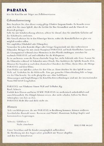 Das Filmklebemittel PARATAX kann ich immer noch liefern. Enthält keine chlorierten oder fluorierten Kohlenwasserstoffe, ist nicht krebserregend, nicht giftig, reizend. Dickt nicht ein, bindet langsam. 10 ml 9 Franken, ¼ l 40 Franken Die schweizerischen Giftklassen sind seit der Registrierung des Produktes beim Bundesamt für Gesundheit aufgehoben worden. Die europäische Kennzeichnung ist . -