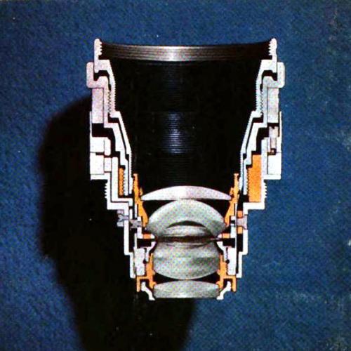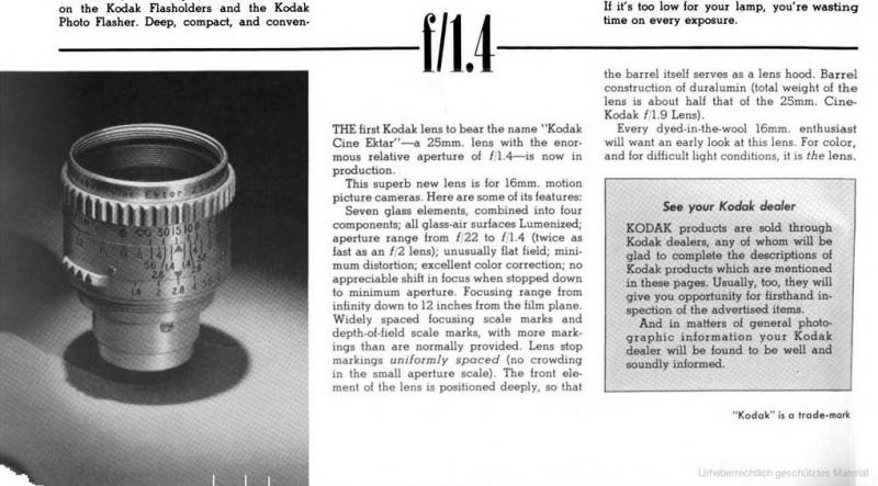 Nachschlag zum Kodak Ciné Ektar II, es scheint ein Achtlinser zu sein. Fest steht, daß Seltenerdgläser verwendet wurden, Lanthankron. Mit Luminized meinte man bei Kodak, daß alle Oberflächen hartvergütet sind. Mit acht Linsen ist apochromatische Korrektur und gute Behebung der meisten Fehler möglich (Astigmatismus, Bildfeldwölbung, Koma, Öffnungsfehler, Verzeichnung). Seit den schwächer streuenden Gläsern geht das auch mit sechs Linsen bis etwa T 1.8. -