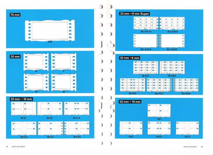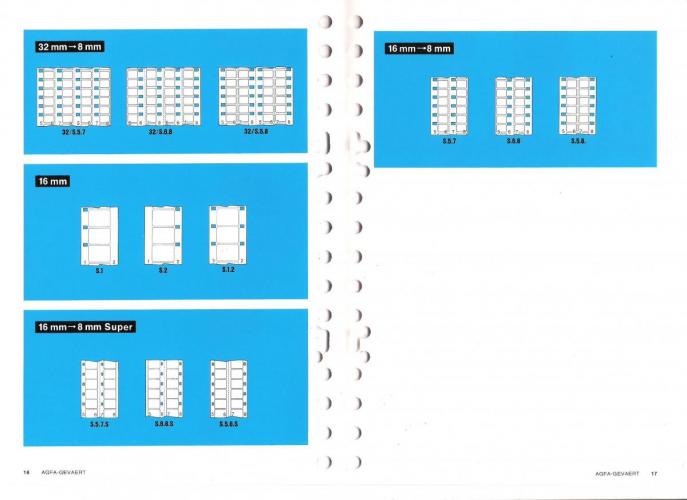 Ich gebe die Seiten 14-15 und 16-17 eines Prospekts von 1988 wieder: Ob noch alle Perforierapparate in Mortsel voll einsatztüchtig sind, weiß ich nicht. Auf jeden Fall ist aller Super-8-Film vorher 35 oder 16 mm breit gewesen. Auch 8 mm entsteht immer aus Doppel-8 oder etwas Breiterem.