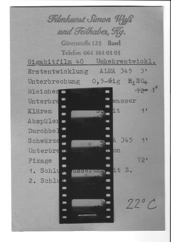 Der Spinner hat die Karte der Umkehrentwicklung von 2001 aufgehoben. ALMA 345 war mein Hausrezept, ein Hydrochinon-Phenidon-Entwickler. Ich habe nichts zu verbergen: Erstentwicklung mit ALMA 345, 22° C, 3' Unterbrechung 0,5prozentiges Schwefelsäurebad, ein paar Sekunden Bleichen, Schwefelsäure und Kaliumbichromat, 1' Unterbrechung mit Sodawasser, ein paar Sekunden Klären, Natriumsulfit, 1' Abspülen, wässern und durchbelichten Schwärzen (Zweitentwicklung), ALMA 345, 1' Unterbrechen, Borsäure, ein paar Sekunden Fixieren, 30" Wässern mit etwas Citronensäure Schlußwässerung Eben geschossen, man sieht einen leichten Fleck im Himmel (des Filmbildes). Ungenügend gebleicht Phantom? Ich habe doch einiges Material verkauft, in der Schweiz, nach Deutschland. Gigabitfilm 40 gab es als Kleinbildfilm auch in Großbritannien, in den Vereinigen Staaten von Amerika, in Frankreich. Gigabitfilm 25, Planfilm 4" × 5", war ein anderes Material der Familie. Als 16-mm-Film ist Gigabitfilm noch an verschiedenen Orten in Kameras, wie ich vermute. Für diesen Herbst sind ein paar Portionen zur Entwicklung angemeldet. Warum Wittner nicht in D.-8 und DS-8 konfektioniert hat? Einesteils ist, wie ich schon sagte, die Nachfrage nach Schwarzweißfilm minimal, weshalb es sich für ihn vermutlich nicht lohnte, da etwas zu unternehmen, einesteils hält er Entwicklung mit spezieller Chemie für abwegig. Da kann ich nichts machen. Wie sich gerade wieder zeigt, braucht der Konsument eine Schachtel, ein Etikett, einen Beipackzettel, den ganzen Werbeschmus, sonst existiert das Produkt nicht für ihn. Dosenaufkleber habe ich jeweils selber gemacht: Ansonsten darf man jederzeit mit dem anderen Spinner Kontakt aufnehmen. Seine Webseite ist ja bekannt.
