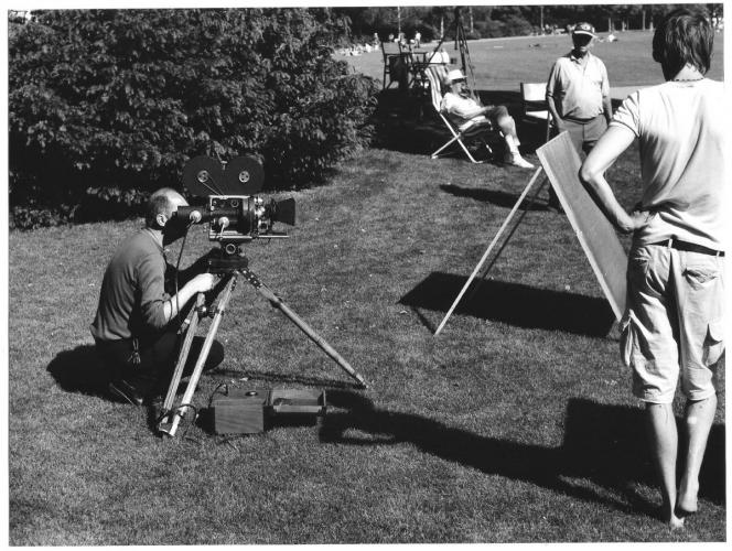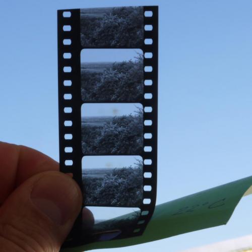 Das Bild bei Wikipedia ist ein Ausschnitt. HIer das ganze: Die Aufnahme machte ich am 9. Juni 2006 am Bieler See mit einer Olympus-Pen-F. auf Gigabitfilm. Das Negativbild ist 18 × 24 mm, hier habe ich eine Vergrößerung auf RC-Papier von nicht ganz 18 × 24 cm mit 300 DPI eingelesen. Ein weiterer Ausschnitt ab Fotopapier, eingelesen mit 600 DPI: Das sind gut drei auf drei Millimeter des Negativs. Man sieht gut die Skala des Fußzählers und die der Verschlußanzeige. Auf dem Negativ ist noch viel mehr drauf. Die Vergrößerung ist nicht mit besonderer Sorgfalt gemacht worden. Gigabitfilm ist ein Wundermaterial. Es ist die Film gewordene Naßkolloidplatte, und das noch panchromatisch. Als Beispiel für die Fotografie des 19. Jahrhunderts eine Aufnahme von Frankfurt am Main: Und hier habe ich als Beleg noch die Schleife auf den Scanner gelegt, die ich mit einem Abschnitt eines von mir umkehrentwickelten Originals machte, das Detlef Ludwig mir 2001 zugesandt hatte: Wer genau hinsieht, entdeckt das Bildformat der Übergangszeit zum Lichtton. Französische Kamera