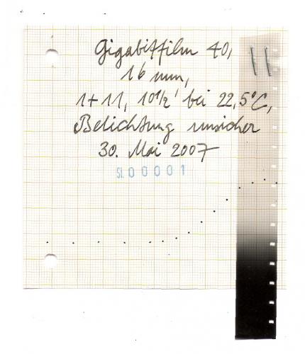 Ja, eben, noch so ein Nachtrag nach Jahren! Ich mußte die 16-mm-Gigabitfilm-Reste wegwerfen. Es war alles über zehn Jahre altes Material und ich kann nicht mehr kistenweise Dosen von Ort zu Ort schleppen, wieder neu verstauen. Möglich, daß irgendwo in dem Chaos, das ich mit mir herumtrage, noch eine Büchse mit Giga liegen geblieben ist. Die Nachfrage war trotz noch ein Mal halbiertem Preis und wegen fehlenden Marketings Null. Das bedeutet nicht, daß es nie wieder so etwas wie Gigabitfilm geben wird. Im Gegenteil, ich bin heute wohl mehr von der Technik angetan als Mr. Gigabitfilm himself. Zur Zeit ist einfach kein frisches Material greifbar, doch das sollte es. Zu einem bestimmten Grad haben sich die Ansichten darüber, was das richtige Gigabitfilm-Material sein soll, bei Herrn Ludwig und bei mir unterschieden. Chemisch kann ich mit ihm nicht mithalten, dafür habe ich, wie mir scheint, in pragmatischer Hinsicht, z. B. puncto Perforieren, einen Vorsprung. Die Nachfrage nach Schwarzweiß-Kinefilm ist viel zu klein. Vielleicht steht in fünfzehn Jahren eine Generation da, die ganz neu ans Phänomen Film herantritt ‒ dann wäre ich der Letzte, der sich dagegen wehren wollte, etwas zu liefern. Heute schweben einfach nur hoffnungsvolle Vorstellungen umher, denen meistens aussagelose Bilderfolgen entspringen. Ich kann’s nicht anders sagen. Als Duplizierfilm war Gigabitfilm, in 35 und in 16, traumhaft. Ich konnte zu jedem beliebigen Kontrast zwischen etwa 1:0,3 bis 1:4 entwickeln (1:1 ist unveränderte Kontrastweitergabe). Das Material ist empfindlicher als die sonst erhältlichen Dupfilme, es ist auf dünnerem Träger erhältlich, es hat eine ausgezeichnete Antistatikbeschichtung und es ist praktisch kornlos. In Filmarchivkreisen hat man, eine traurige Erfahrung, kein Verständnis dafür. Auch bei Kodak versteht man nicht, was dünneres Filmmaterial bedeutet. Selbst als ich darauf aufmerksam machte, daß Kodak schon knapp vier Hundertstel dünnen Träger beschichtet hatte, war keine Synapse frei für eine Schaltung. Also, das wäre jetzt öffentlich erklärt mit dem Hinweis darauf, daß ich nach wie vor auf dem Gebiet der Filmtechnik etwas unternehmen will. Nach vierzehn Jahren habe ich mich aber wieder um 180 Grad umgedreht, blicke nach vorne, bemühe mich um Neues. Während es Hundert zu Eins dagegen steht, daß positiv auf meinen Rekurs eingegangen wird, hege ich natürlich wie jeder Mensch Hoffnung. Anderes bleibt nicht. Eine gut etablierte Kaste von Sozialtätern kann sich ja nicht selber abschaffen wollen, weshalb sie Recht behalten werden, auch mit faulstem Zauber. Densograph, Graukeile, einiges konnte ich bis jetzt erhalten. Der halb fertige Prototyp einer neuartigen Kopieranlage ist auch noch vorhanden. Genau das haben sie mir entgegengehalten, ich hätte ja gar keine Maschinerie.