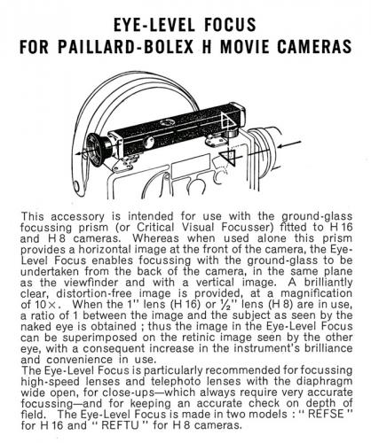 Anschluß an Beitrag #83, das Auflagemaß hat auch nicht gestimmt, 17,54(5) mm statt 17,52(6) mm. Ich habe das Distanzblech, das Paillard in 0,02-mm-Stärkestufen auf Vorrat hat, beidseitig überschleifen lassen. Leider fehlt mir eine kleine Flachschleifmaschine. Zurück an der Werkbank messe ich die montierte Front und stelle fest, daß es einen Unterschied zwischen Links und Rechts gibt, wie auch schon gehabt. Das wäre der dritte Fehler, zwei Hundertstel Differenz. Fensterplatte ringsum messen und siehe da, sie ist alles andere als planparallel. Ich könnte einseitig einen Blechstreifen unterlegen. Aber ich bastle nicht. Morgen zur Lehrwerkstätte, wo ich meine Grundausbildung genossen habe. Dort kann man das perfekt feinschleifen und die mittlerweile doch schon etwas zerkratzten Filmlaufflächen wieder polieren. An dieser Stelle ein Rat an die Bolex-Besitzer, die das Zubehör Einsatzprisma haben: Trennt euch davon. Egal, ob das ältere oder das jüngere Modell, man zerkratzt mit dem Glasprisma leicht die polierte Fensterplatte. Glas ist härter selbst als gehärteter Stahl und mit der mattierten Glasfläche braucht man nur ein wenig hin und her zu wackeln gegen die Zugkraft des viel zu starken Magneten und schon ist die geschlossene Oberfläche futsch. Der Film kann an feinsten Brauen Abrieb lassen, wohlgemerkt Gelatine, der sich schnell zu ziemlich festsitzenden Knubbeln aufbaut. Das ist lästig und nicht leicht zu entfernen, wobei auch die Gefahr besteht, das man das Rähmchen für die Seitenführung beschädigt. Viele wissen nicht, wie man den Filmkanal sauber hält.* Die weitaus bessere Lösung für genaues Einstellen einer Optik auf Paillard-Bolex-H-Kameras mit Revolver ist die mit dem eingebauten Mattscheibenprisma hinter der oberen Objektivposition. Die allermeisten H-Kameras ohne Reflexsucher haben dieses Prisma. Meine H-16 S hat es als seltene Ausnahme nicht. Darum behalte ich sie auch. Die H-16 M besitzt es auch nicht. Das Zubehör bietet bequeme und vergrößerte Sicht auf die Mattscheibe von hinter der Kamera: Übersetzung des englischen Textes: Dieses Zubehör dient dem Gebrauch des Mattscheibenprismas (oder Genauscharfstellers), der in Kameras H 16 und H 8 eingebaut ist. Während dieses Prisma beim unmittelbaren Gebrauch ein waagerechtes Bild vorne an der Kamera liefert, ermöglicht das Zubehör die Scharfstellung von der Kamerarückseite aus, auf selber Höhe mit dem Sucher und mit aufrechtem Bild. Ein klares, verzerrungsfreies Bild ist zu sehen in zehnfacher Vergrößerung. Wenn das 25-mm-Objektiv [H 16] bzw. das 12,5-mm-Objektiv [H 8] in Gebrauch ist, sind das Bild und das mit nacktem Auge gesehene Objekt gleich groß, daher kann das Scharfstellbild mit der direkt betrachteten Szene zusammengelegt werden mit der Folge größerer Brillianz des Instruments und angenehmeren Gebrauchs. Das Zubehör empfiehlt sich besonders zur Einstellung lichtstarker Objektive und von Teleobjektiven bei offener Blende, für Nahaufnahmen, welche immer sehr genaues Fokussieren verlangen, und um die Schärfentiefe zu überwachen. Das Zubehör wird in zwei Modellen geliefert: REFSE für die H 16 und REFTU für die H 8. Um jegliche Parallaxe auszuschalten, braucht man noch dieses Zubehör: Ein Reflexsucher hat schon immense Vorzüge. Es gibt aber noch keinen Reflexsucher ohne irgendwelche Nachteile . . . :look: -