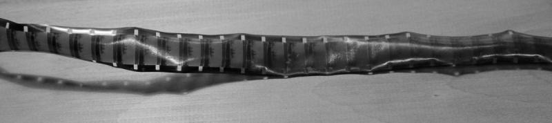 Eine Kopie, es sieht zwar auf den ersten Blick wie ein Umkehroriginal aus, ist jedoch ein Kontaktpositiv ab Reduktions-Zwischennegativ, etwa Mitte der 1930er Jahre, Bilder aus Ägypten. Etwa 35 Promille Längenschrumpfung Heute aufgenommen. Man sieht auch, wie die Bildgelatine, genau gesagt, die dünne Deckschicht aus leerer Gelatine, retikuliert ist, eben verschrumpelt. Das darf man nur noch trocken angehen, Handreinigung mit weichem Samt. Was man zum Duplizieren für einen Aufwand betreiben muß, will ich hier nicht beschreiben. Die Bilder müssen den Aufwand wirklich lohnen, sonst bleibt man besser bei einer Abtastung. Diese stumme Kopie kann ruhig sterben, ich meine zerfallen, der Inhalt ist eigentlich wertlos. Solche Streifen gab es früher für Vorträge oder für die private Sammlung. Ein paar Kupfer treibende Handwerker werden gezeigt, Kamele, Kairo von weitem und in den Gassen, ein Boot, zum Schluß eine Möwe. Übungsmaterial für mich, ich bin am Suchen nach der besten Methode, kurzfristig einen einigermaßen ebenen Abschnitt (ohne Schneiden) herzurichten. Wärme, Dampf, Begasen, Druck, der Ansätze sind nicht wenige. Zugspannung ist unzulässig, auch wenn man beim Anziehen von Hand eine eigenartige Elastizität bemerkt, die frischer Film nicht hat. Die Gefahr des Zerreißens ist zu groß, auch und gerade bei Spleißen. Eine winzige Randverletzung genügt, um ein Durchreißen zu ermöglichen, und das wollen wir nicht. Es gibt noch viel zu tun. Wenn jemand wirklich eine Naßreinigung durchführen (lassen) will, dann muß das von Hand und ganz sorgfältig gemacht werden. Sobald sich Ablösung der Beschichtung zeigt, muß man abbrechen. Also Stundenansatz mal Zeit, Proben, . . . -