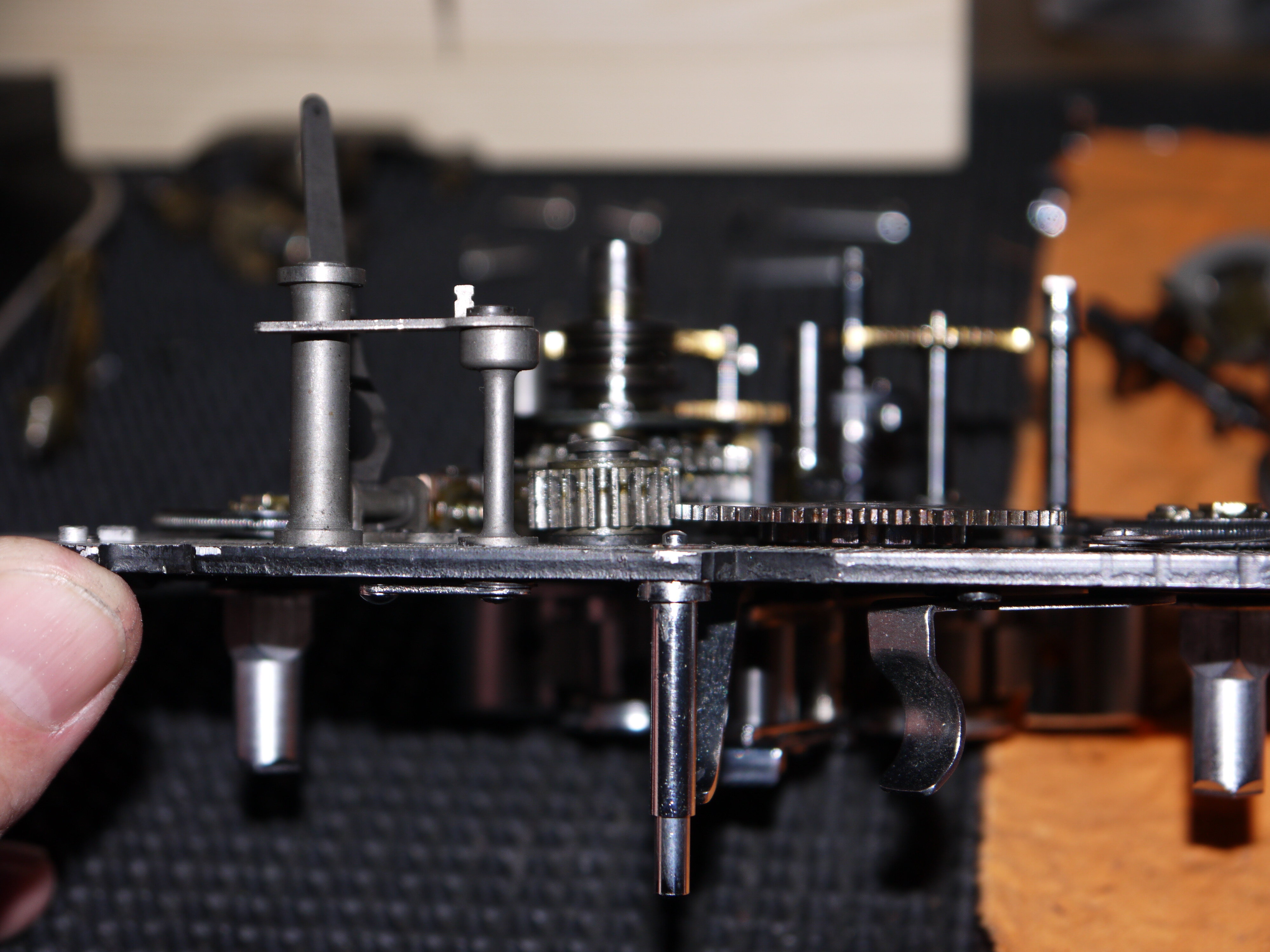 Ich glaub’, ich hab’ vergessen zu sagen, was ich mit rauer Behandlung meine. Wenn man das Federwerk mit oder ohne Film ablaufen läßt, wird es durch das Sperrgetriebe angehalten. Schäden sind nicht zu erwarten bei Geschwindigkeiten bis – nach Paillard – 32 B./s. Bei Tempo 64 sieht’s anders aus, obwohl das eigentlich möglich sein sollte. Wenn man das Federwerk aufzieht, ist der Geschwindigkeitsregler nicht in Funktion, man geht mit voller Gewalt an der Aufzugkurbel über ein Zwischenrad der Kupplungsgruppe aufs Federhaus. Am oberen Anschlag, ich nenne ihn so, verliert sich überschießende Energie nun über das Zwischenrad in den Zähnen der Sperrräder. Ein Zahn steht an einem Steg des Gegenrads an. Vom erwähnten Kupplungsrad aufs Federhaus haben wir eine Untersetzung von 3:8, vom Federhaus eine Übersetzung aufs Zwischenrad von 60:11 und dann wieder Untersetzung 2:5. Welches Teil kommt also am meisten dran?- 136 Antworten