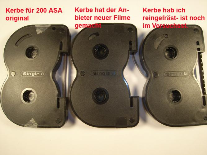 Hallo, ich habe mir einige Kassetten auf 200ASA gefräst und meine ZC mit DIP-Schaltern versehen, und die Einstellung im Kassettenfach auf diese Schalter gelegt.