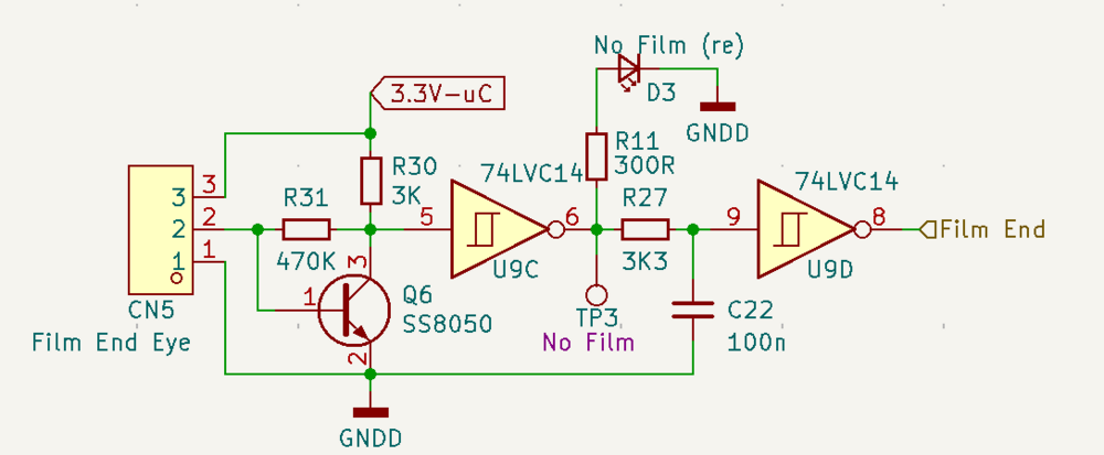 Tja, und soeben noch so einen (ähnlichen) Fehler gefunden und schliesslich behoben. Diesmal war es der Motortreiber. Bei einem schwergängigen Projektor hat also auch der DRV8871 gelegentlich (über Masse) in den 3v3-Kreis geblutet – und das störte zwar nicht den uC, aber den Schmitt-Trigger für den Film-Ende-Detektor. Siehe unten, im Scan-Betrieb sah ich gelegentlich die "No Film" LED aufblitzen. Erst habe ich das in Software "entprellt", aber eien Lösung ist das nicht. Das Problem ist, das der Tiefpass (C22/R27) zu weit hinten sitzt. Ein "aufgebodgter" 100n zwischen Pin 5 und GND haben das Problem jetzt behoben. Nicht dass Ihr denkt, ich würde nix tun 🙂 Neben der (jetzt kompletten) Bauanleitung habe ich auch einen kleinen Shop vorbereitet, in dem es auch ein paar benötigte Bauteile geben wird, das spart Versandkosten. Auf einiger dieser Teile warte ich noch, aber lange wird es jetzt echt nicht mehr dauern. Heute löte ich erstmal die obigen beiden Verbesserungen auf die bestehenden 20 Boards auf, damit dann auch alles reibungslos läuft! Schönen Sonntag Euch! -