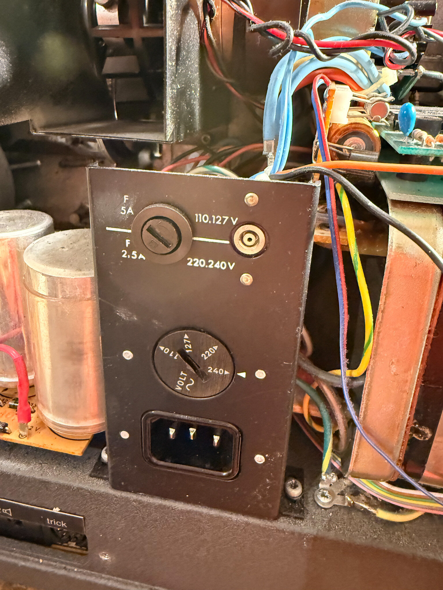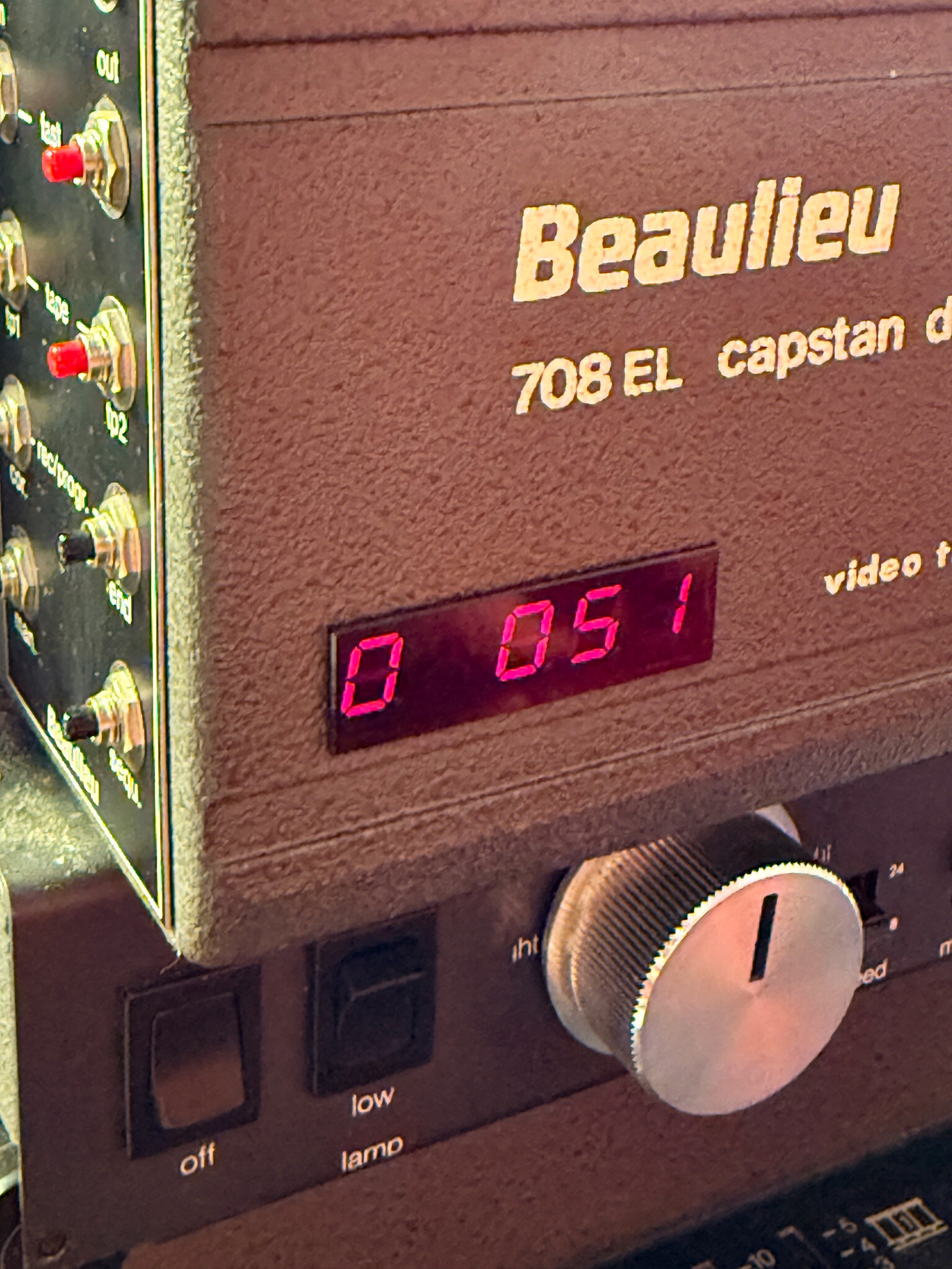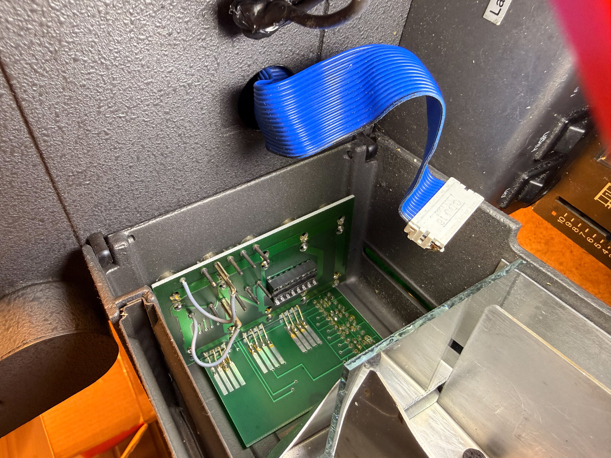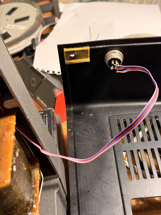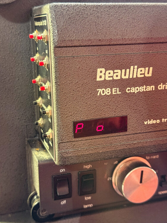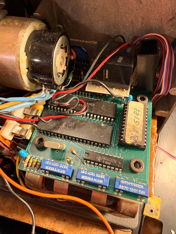 So, gestern habe ich mal 15 Minuten abgezwackt und den 708 genauer angesehen. Was für ein schönes Stück Hardware! Getan habe ich noch nichts dran, das kommt später. Er läuft gut und sehr ruhig, und er riecht total nach Opa. Also genau wie das Rasierwasser meines Opas. Krasser Déja-santé-Effekt! Ich bin erstaunt, wie leise das Ding ist. Grenzt fast an Studioklasse. Am lautesten ist der kleine Kassettenrekordermotor für das Capstan-Schwungrad, der läuft vermutlich trocken oder ist kaputt... sicher reparabel. Besonders beeindruckt hat mich ja auch der Schärfetrieb. Und die Präzision der Objektivhalterung. Da hat Bauer bei der Studioklasse aber ganz mächtig am falschen Ende gespart! Noch ein paar schnelle Eindrücke: Oberhalb des Trafos ist diese Platine montiert. Das ist wohl der "Fadecomputer". Darauf zu sehen: Eine CPU Intel 8085, ganze 256 Byte (!) RAM und ein Eprom von Mai 1983 mit der Firmware (nannte man damals noch nicht so, denke ich). Die blauen Günther-Dinger konnte ich noch nicht identifizieren... ich vermute Optokoppler? Vom Computer geht auch noch ein Kabel an die Rückwand. Da fehlt mir wohl ein Teil, das jetzt irgendwo im Müll liegt... schade. Neben dem Spannungswähler hab ich einen X-Kontakt. Ist das normal? Die Bedieneinheit im Lampenhaus von hinten. Mit dem "Computer" wird sie über ein Flachbandkabel verbunden, dass in einem DIP-16 Sockel steckt... etwas wackelig, aber warum nicht 🙂 Ein Pin war abgebrochen, nach provisorischem Ersetzen zeigt das schicke Display sogar was an. Allerdings nur entweder "P o" oder, nach einem Tastendruck, "0 051". Mehr habe ich noch nicht rausbekommen. Der Projektor ist total verdreckt. Ich glube, der wurde noch nie sauber gemacht. Hier nur mal ein Bild der Abdeckung unter den Tonköpfen (sorry, unscharf, es schüttelte mich so): Bei Ebay findet man einen (vermutlich) passenden Bedienteil zum Anschluss, hergestellt von Ritter Mannheim. Leider will der Verkäufer 399€ dafür haben. Eher nicht. 🙂 Auf jeden Fall ist das ein schönes Restaurationsprojekt (irgendwann) und zum Schlachten wäre der Projektor viel zu schade gewesen. -