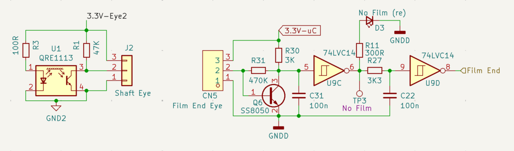 Der Eingang ist ein Ausgang 🙂 Hier links siehst Du "ein Auge" (die kleine Abbrech-Platine am Controller): Der Sensor bekommt 3,3V von der Controller-Platine. R1 (47k) ist ein Pullup-Widerstand, der das mittlere Kabel (Pin 2) auf HIGH zieht. Wenn der Reflexsensor (U1) etwas vor die Nase gesetzt bekommt, beginnt der Fototransistor darin zu leiten und zieht Pin 2 dann auf Low. Die Schaltung rechts (auf der großen Controller-Platine) verstärkt das Signal, filtert Störungen raus (LED-Birnen und anderes Umweltgeblinke) und macht ein hübsches Digitalsignal daraus. So müsstest Du das Ding jetzt anschliessen: Auf der Controller-Platine einen 10-47k Widerstand zwischen "+" und "^" klemmen oder löten. Das ist dann das Äquivalent zu R1 auf meiner Platine: Der Pullup. Braun Deiner Gabellichtschranke (5-24V DC) an Pin 2 des Raspi-Connectors (rechts unten, neben C23) Blau Deiner Gabellichtschranke (GND) an "-" der "End"-Klemme. Mit diesen beiden Kabeln leuchtet jetzt deren IR-LED. Schwarz oder Weiss an "^" der "End"-Klemme. Ob Schwarz ("Dark on") oder Weiss ("Light on") finde ich im Datenblatt nicht eindeutig, probier es einfach aus. Der Controller hat links eine rote "No Film" LED; die muss angehen, wenn kein Film (mehr) eingelegt ist. Wenn es bei Dir andersrum ist, tausche schwarz/weiss oder kehre es im Settings Menü (kommt gleich) um. 🙂 -