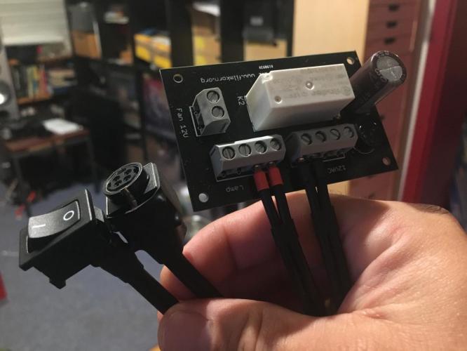 Hier ein Foto der Platine, des Schalters und der Buchse für das Netzteil. Die Einbauanleitung habe ich mal hier abgelegt. Das natürlich stabilisierte und kurzschlussfeste Netzteil leistet dauerhaft 13,4A bei 15V und ist so präzis wie kompakt -- fällt also viel weniger auf als meine erste Version... -