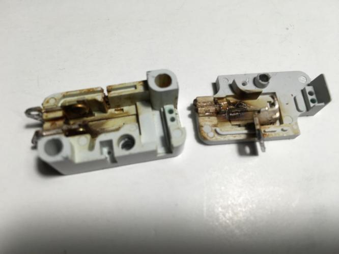 14. Ich hab ja eine Schwäche für die Noris-Projektoren. Ich mag sie, weil sie Vor- und Nachwickelzahnrad haben, weil die Filmbahn aus poliertem Metall ist, weil das Andruckteil auf der Lampenseite und somit auf der "richtigen" Seite sitzt, weil man den Film leicht jederzeit entnehmen kann. Ich mag sie wegen des Schneider Xenovaron 11-30/1,1 dass ich in jeden meiner Norisse (Noren? Norii?) reinstecken kann. Sie laufen saustabil und sind gut zu reparieren und zu schmieren. Und ich hab zugegebenmaßen auch einige davon, natürlich alles verschiedene Modelle. Besonders wichtig ist mir der "Noris Exclusiv 3000", der zwar einen bescheuerten Namen hat, aber auch einige Besonderheiten: - Per Schalter umschaltbar zwischen S8 und N8 (kein Umbau nötig) - 12V/100 KLS Lampe, umrüstbar auf 15V/150W - Slowmo-Modus mit 3-4 fps - Nachgerüstetes Poti zur Stufenlosen Geschwindigkeitsregelung (nebst der geregelten 18/24er Gänge) - Sehr leiser Lauf Tja, und der machte mir nun neulich Probleme. Er blieb mitten im Betrieb plötzlich stehen. Die Lampe ging noch, der Motor machte keinen Mucks mehr. Riemen war in Ordnung (ich hatte noch nie einen Noris mit defektem Riemen!), also rauf auf den OP-Tisch mit dem guten Stück. Der überschaubare Schaltplan und ein paar Messungen haben es schnell deutlich gemacht: Der Grund lag am Hauptschalter, der dem Motor keinen Saft mehr lieferte. Bei den neueren Noris-Geräten ist der Hauptbetriebsschalter eine einfache Welle mit mehreren Nocken, die eine Batterie an Mikroschaltern betätigen. Je nach Position leuchtet die Lampe in verschiedenen Helligkeiten und der Motor erhält seinen Saft, eigentlich ganz einfach. Um an dieses Hauptschalteraggregat heranzukommen, muss man den Noris leider sehr weit zerlegen, weiter als ich das bisher jemals musste. Auch ohne Anleitung war das aber nach einer Stunde konzentriertem Ansehen schadenfrei geschafft, und eigentlich auch nicht weiter schwer. Man muss halt eine Menge Schrauben lösen, die aber alle gut erreichbar sind (Bodenplatte). Nach dem Zerlegen des Schalteraggregats war der Übeltäter schnell identifiziert: Im Motorschalter muss es mächtig gefunkt haben. Der Mikroschalter klickte nicht mehr, hatte einen Riss und Schmauchspuren. Zerlegt wurde der Schaden deutlich: Hier ohne die Kontaktfeder, aber man sieht es auch so: Alles komplett festgebraten. Warum das hier so gefunkt hat, ist mir nicht klar, vermutlich lief der Projektor beim Vorbesitzer lange ungeschmiert (hoher Einschaltstrom). Sind die Kontakte erst einmal verbrannt, funkt es zukünftig umso mehr. Mit 5A/125V ist der Schalter eigentlich auch ausreichend dimensioniert. Leider gibt es den verwendeten Cherry E-23 nicht mehr, was mich erst einmal etwas frustrierte. Kurzes Stöbern bei Reichelt machte mich aber wieder fröhlich: Es gibt von Marquardt einen Ersatztyp mit identischen Abmessungen, und der leistet sogar 10A/400W -- Kostenpunkt sagenhafte €2,14! Schnell bestellt waren schon am nächsten Tag 5 Ersatzschalter am Start: Links alt, rechts neu. Auch wenn die anderen Schalter äußerlich noch i.O. scheinen, habe ich sie gleich alle ersetzt. Die neuen Klicken schöner und so spare ich mir erneutes Zerlegen. An den Motor und die Schalter kamen noch ein paar Entstörkondensatoren, der Motortransistor BD709 bekam neue Wärmeleitpaste und binnen 30 Minuten war alles wieder zusammengesetzt und neu eingestellt. Nun spielt der kleine Noris wieder wunderbar. Für N8-Filme ist er ob seiner Lichtstärke, der Ganggenauigkeit und des 11 mm Objektivs mir einfach der liebste. Wer auch Schalterersatz braucht: "MAR 1005.0401" heisst das gute Stück bei reichelt.de. Auf die nächsten 30 Jahre, kleiner großer Noris!