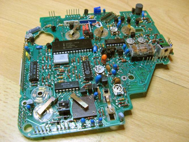 Lustig, so eine 6080 von innen: Der große Käfer da oben ist ein Microcontroller von Intel aus dem Jahre 1977, Typ 8021 aus der Reihe 8048. Dieses Rechengenie hat sagenhafte 1 KB ROM und volle 64 Byte Arbeitsspeicher! Übrigens ist dieser Chip kein Exot: Er war ein großer Erfolg und wurde massenhaft verwendet (Sinclair QL Computer, Donkey Kong Spielautomat, Motorsteuerung Bully T3, viele Synthesizer etc.). Er war direkter Vorläufer heute sehr erfolgreicher Reihen (8051 etc) und es ist auch nicht auszuschliessen, dass er heute noch in irgendeiner Waschmaschine o.ä. seinen Dienst tut. Oder eben in der Nizo.