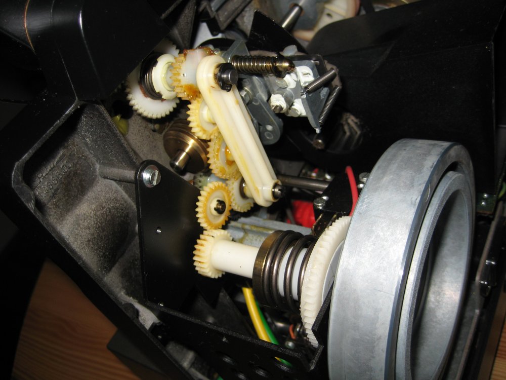 Danke für die Info! Nur mal zum Verständnis - wo befindet sich im Projektor dieser Schwenkmechanismus? Bin technisch nicht sonderlich versiert ... ich bitte daher um Nachsehen. Die zwei besagten Kunststoffzahnräder, die vor der Schwungmasse sitzen, sind im ständigen Kontakt miteinander und die Verzahnungen der Kunststoffräder reiben aufeinander - das macht halt den riesigen Lärm. Wenn die Schwungmasse einmal am Laufen ist, klappt es auch mit den Zahnrädern. Ich habe den Eindruck, dass die beiden Kunststoffzähnräder in einem festeren Kontakt miteinander sein müssten (?) -