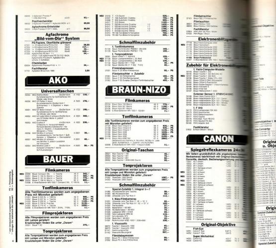 Hallo Olaf! Der Auszug der Preisliste entstammt der entsprechenden Beilage einer alten Color Foto. Über die jahre verteilt habe ich wohl 3 oder 4 dieser Beilagen. Finde ich diese alten Preislisten auch sehr informativ und hilfreich. Der Würzburger Fotoversand war bei den Preisen immer recht günstig. Habe dort in den 80ern so einiges für meine damalige Minolta Spiegelreflex Ausrüstung gekauft. Vor einiger Zeit hatte ich mal einen Link zu einem Photo Porst Katalog angegeben. Hast Du Dir diesen angesehen? Fand den auch ganz interessant.