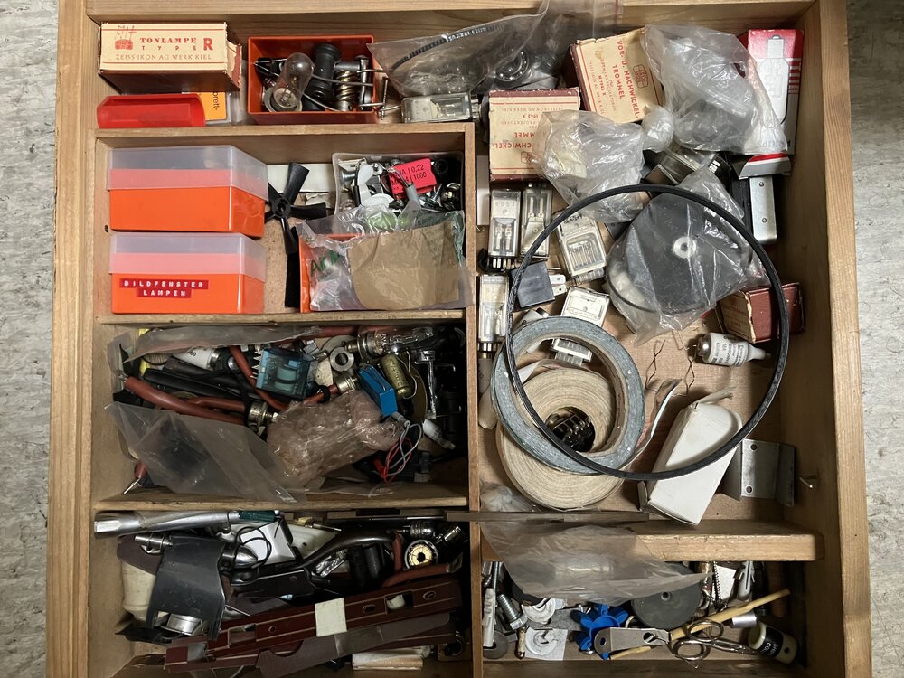 Wie auf dem Bild zu sehen, biete ich hier eine ganze Schublade voll mit Ersatzteilen für diverse Projektoren an. Bei uns waren damals 2x Ernemann X, 4x FP6 und 2x FP30 verbaut, daher gehe ich mal von Ersatzteilen besonders für diese 3 Projektoren aus. Den genauen Inhalt kann ich nicht aufschlüsseln, einfach das Bild inspizieren. Verkaufspreis VB 75,-€ (ohne Schublade, NUR Inhalt) Der Verkauf erfolgt unter Ausschluss jeglicher Sachmängelhaftung. Die Haftung auf Schadenersatz wegen Verletzungen von Gesundheit, Körper oder Leben und grob fahrlässiger und/oder vorsätzlicher Verletzungen meiner Pflichten als Verkäufer bleibt davon unberührt.