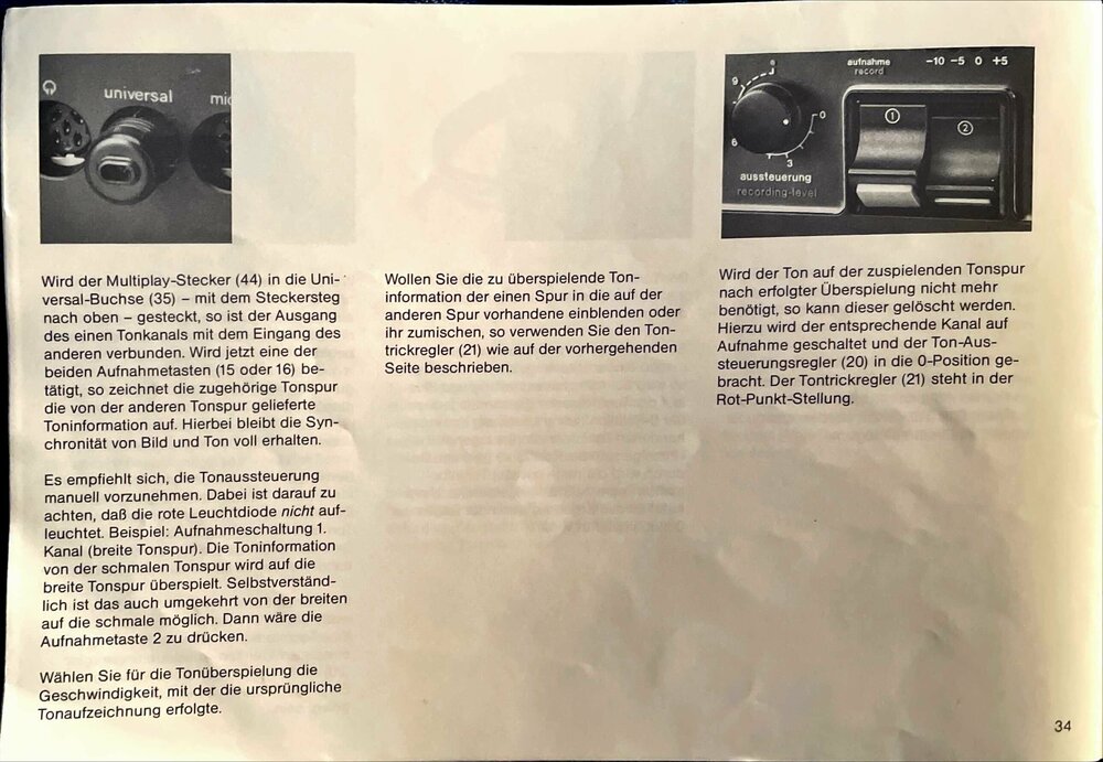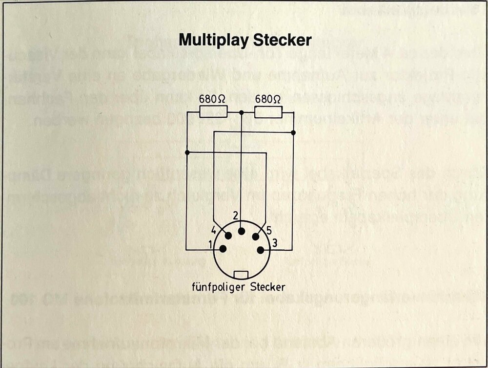 Den Multiplay Stecker kann man ganz einfach nachbauen, da sind nur 2 Widerstände und 2 Drähte drin: aus „Walter Werner: Filmton mit dem Tonbandgerät“