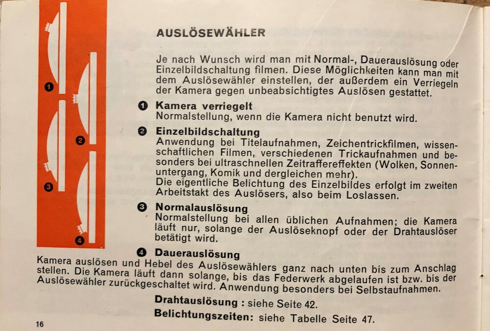 24. Hallo Simon, habe hier eine C8 von 1954, die belichtet Einzelbilder beim Drücken des Drahtauslösers, nicht beim Loslassen. Eine D8L von 1959 und eine D8LA von 1962 zeigen hingegen das von Dir beschriebene Verhalten (Belichtung beim Loslassen). Allerdings ist das Verhalten in der Bedienungsanleitung beschrieben: