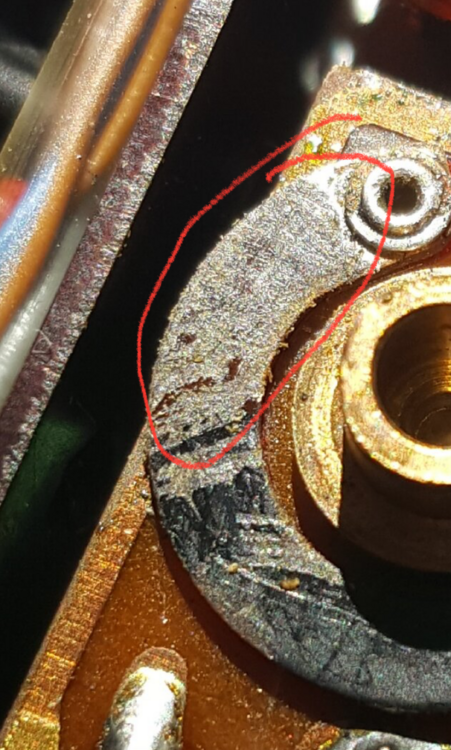 Das ist ja kein Metallring, sondern die (offenliegende) Widerstandsbahn eine Kohleschicht-Potis. Die Kohleschicht sieht nicht nur verschmutzt aus, an der wurde anscheinend auch herumgekratzt. Wenn aber auch im Automatikbetrieb Probleme aufgetreten sind, könnte auch der Schleifkontskt korrodiert sein? Hast Du von dem auch mal ein Foto? Zur Abhilfe könntest Du alles (Widerstandsbahn, Schleifkontakt mit Isopropyl und/oder Tuner 600 reinigen, keinen normalen Kontaktspray nehmen!