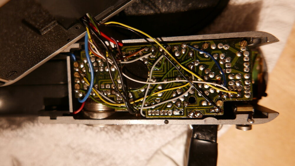 Nachdem ich im Herbst schon meine H8 RX als repariert in den Schrank stellen konnte, habe ich mich jetzt am Jahresanfang mal der defekten Nizo Professional zugewandt. Nizo Pro Fehler2.mp4 Die Kamera hatte schon 2022 in Deidesheim die mehr als unangenehme Eigenschaft, nach dem Loslassen des Auslösers für einige Zeit nachzulaufen. Im gezeigten Video ist es nur bis zu 1 Sekunde, aber (Vorführeffekt) es sind auch mitunter 5 Sekunden und mehr. Das Hauptproblem, ist, daß sie während dieser Nachlaufzeit keinerlei Synchronimpulse erzeugt, was mir schon das Editieren des Deidesheim 2022 Films erschwert hat. Zudem macht sie auch bei Einzelbildeinstellung unregelmäßig mehrere Bilder... Also bin ich der Fehlerbeschreibung auf diese Seite gefolgt: ACWSOFT - Super 8 - Kodak Ektachrome 100D E100D, Kamera, Kameras, Nizo Der Artikel und das Bild dort ermutigen ja nicht gerade zu einer DIY Reparatur... 😞 Ich habe mich aber dennoch daran gemacht. 1. Batteriekorb entnehmen, Gefahr von Beschädigung durch Kurzschlüsse ausschließen 2. Die Stativplatte abschrauben 3. den Handgriffträger abschrauben 4. den Handgriff gaaaanz vorsichtig anheben (Stifte fixieren ihn am Gehäuse) und zu einer Seite (der richtigen!) umlegen 5. die 6 kleinen Messingschrauben an der oberen Leiterplatte lösen und nicht (!) verlieren 6. nun kann diese Leiterplatte vorsichtig nach oben aus dem Griff gehoben werden. Die Bauteile dieser Leiterplatte stecken zwischen den Bauteilen der Leiterplatte darunter. Zudem haben beide dünne Drahtverbindungen zueinander und jeweils durch eine Lücke im Gehäuse zum Hauptgehäuse, lassen sich also nun nicht mehr frei bewegen. 7. jetzt kann man den 470 µF erkennen und weiter unten (Richtung Hauptschalter) einen weiteren Elko 8. ich habe mich entschieden nach 40 Jahren beide Elkos zu tauschen und diese mit einem speziellen Seitenschneider entfernt 9. die neuen Bauteile mit höherer Spannungsfestigkeit als die alten, dafür kleiner bauend 10. und im eingebauten Zustand 11. nun die Leiterplatte wieder "saugend/schmatzend" zurück ins Häuschen schieben Das war mehr als anspruchsvoll, da sie nur in exakt einer Position paßt, man nichts sieht und die winzigen Messingschrauben zum Schluß wieder in die kleinen Messingröhrchen passen müssen, die vom Boden des Handgriffträgers aufragen und die obere Leiterplatte tragen Geschafft! 🙂 12. wieder alles zusammenschrauben (und nicht wie ich erst mal die nur eingelegten Auslösetaste vergessen)