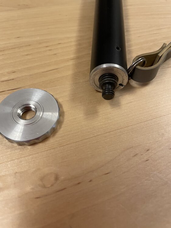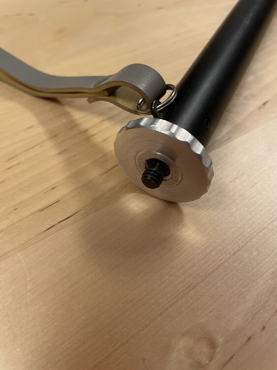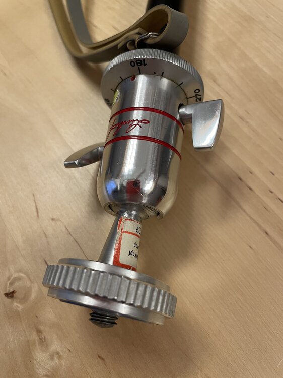Das Bolex-Einbeinstativ gab es wohl in 2 Ausführungen, mit und ohne Kugelkopf. Meines hatte einen kleinen Neiger von Linhoff drauf, als ich es gekauft habe, der war wohl nicht original. So sieht es ohne Kopf aus: An der Schraube kann man einen kleinen Kopf (z.B. Kugelkopf) mit 1/4 “ Anschluß montieren. Für Köpfe mit 3/8 “ Anschluß nimmt man die Aluscheibe ab: Ich habe dann einen recht stabilen, kleinen Kugelkopf von Linhoff montiert: der hat unten einen 3/8 “ Anschluß, oben eine 1/4 “ Schraube.