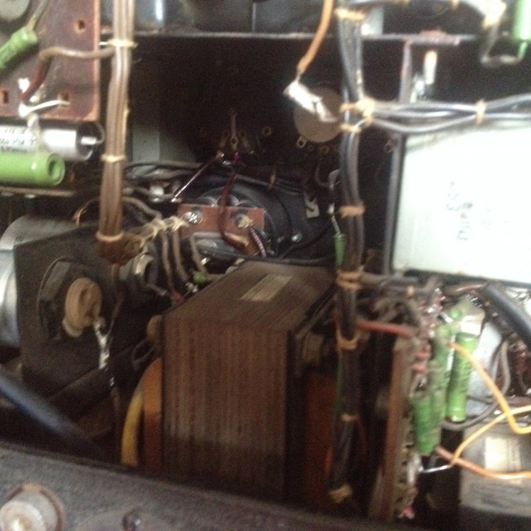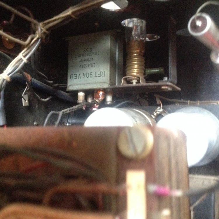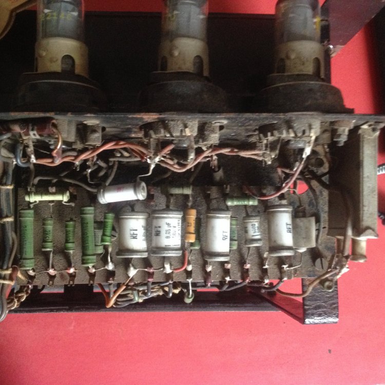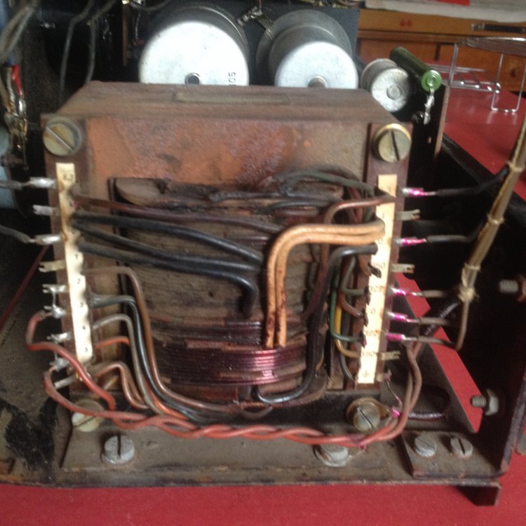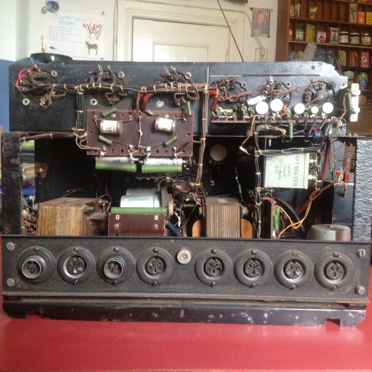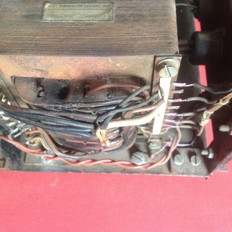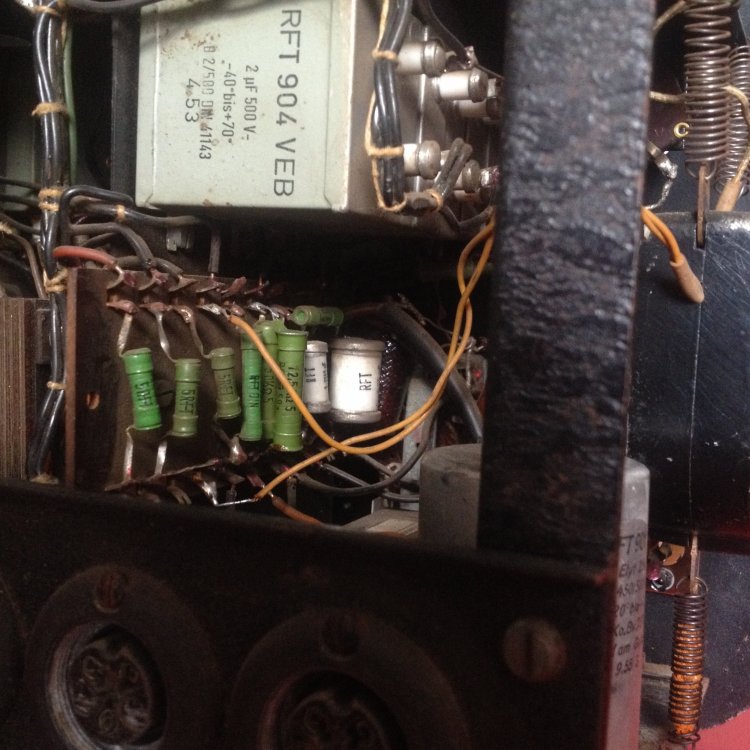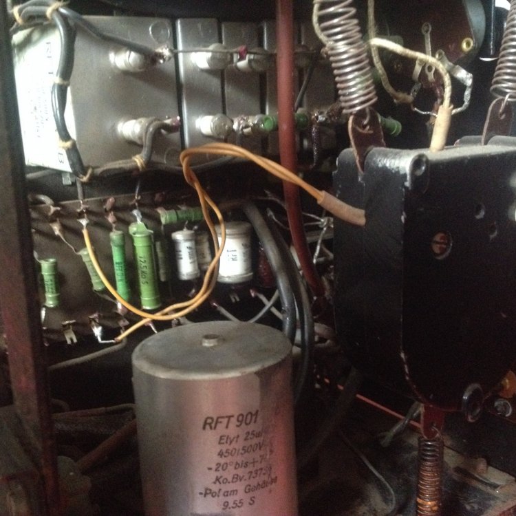 vielen Dank für die umgehende Antwort und Eure Gedanken zu dem Thema. Ja, ich gehe sogar mal sachte von 65 Jahren aus. Ich habe auch schon oft in 50 Jahre alte Gitarrenverstärker geschaut, aber die Teile - vor alem ELKOS und andere Kondensatoren in den TV2 sehen echt spacig aus; gerade weil ich schon von den alten Gitarrenverstärkern das Problem kenne, dass passende Werte bei den Elkos manchmal schwierig zu bekommen sind, frage ich mich gerade, ob es hier entsprechende Fachleute gibt, die wissen, was einen da erwartet, bzw. wo man die passenden Elkos bekommt. Ich hänge mal ein paar Fotos an. Zu allem Überfluss ist , wie sich das gehört, in den 50er Jahren alles frei verdrahtet, die Röhren auf brüchigen Bakelit Sockeln. Also Eure Erfahrungswerte bei der Restauration von der Kiste sind gefragt. Die Frage nach der Überbrückung des 100V Trafos zielen eher dahin, dass ich es so verstehe, dass die Transformation vorgenommen wurde, um weite Kabelwege Verlustfrei zu überbrücken. Klanglich ist das ja aber nich der Hit und da ich den Projektor gerne für die Wiedergabe von "Direkt to Film" Filmen nutzen möchte, wäre eine möglichst gute Tonwiedergabe schön und wünschenswert Ja, so sieht's aus (siehe Foto) Ich frage mich nur, wer sollte 220 Volt Kabel an einen Großtuchel löten, um die Kiste an 220V anzuschließen??! ICh habe die Kiste mit einer ganzen Anlage erworben. Gehe davon aus, dass da ein anderer Defekt den Trafo abrauchen liess??! Dem Rost nach zu urteilen könnte auch Feuchtigkeit ihr Werk getan haben.... Müsste ich mal schauen, ob das Sinn macht... habe ja vor, den nur mit der TK Anlage zu benutzen. Erfahrugsgemäß eine teure Sache so ein Trafo? Wenn jemand also einen Trafo hätte hier im Forum, freue ich mich. In dem Gerrät sind übrigens 2 große und ein kleiner Trafo verbaut, wenn ich mich nicht täusche. Die 2 großen sehen recht baugleich aus, zumindest von der Größe. Ohne weiteres Aufschrauben ist es allerdings etwas unübersichtlich im Gerät und die Typenschilder sind meist verblichen oder total eingedreckt....
