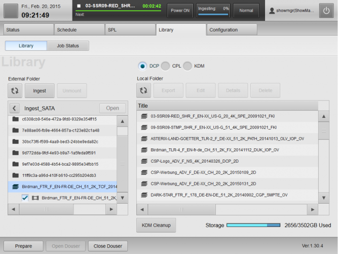 Hallo zusammen, Das ist ja interessant. Die OmU in Deutschland liess sich ebenfalls nicht ingesten. Welchen Phänomen hattet ihr da? Ebenfalls Hänger bei 0%? Welches Labor hat die Birdman DCPs in Deutschland hergestellt? Ebenfalls Deluxe? Wir haben in der Zwischenzeit die synchronisierte Version erhalten. Diese lässt sich problemlos ingesten. Ist zwar nicht unsere Wunschversion, aber besser als nichts... LG valli