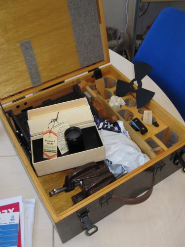Genau, ich habe noch einen. Er befindet sich sich in einem Koffer mit einer Tonfilmkamera, den ich eigentlich mal entsorgen müßte. Bisher brachte ich es noch nicht fertig. (Siehe Bild). Etwa im Jahre 2003 habe ich einige dieser Filme aus der Bucht gezogen. Ein Teil wurde optisch zunächst ganz gut, ist heute aber bis zur völligen Transparenz ausgeblichen. Der andere Teil läßt sich auch heute noch gut wiedergeben, allerdings lief die Tonfilmkamera damas wohl zu langsam, so daß sich die aufgenommen Personen beim Projizieren wie Micky Mäuse anhören. :D Apropos Tonfilm: Erfreulicherweise zeichnet sich ja in den ganzen Beiträgen ab, daß man bald entwickelte Filme bespuren lassen kann. Meine Frage dazu: Worauf sollte ich bis dahin am besten den Ton aufnehmen, bis er auf die dann bespurten Filme überspielt werden kann? Was verwendet Ihr dazu? Einen Cassettenrecorder? Ein MP3-Aufnahmegerät? Wie bekommt Ihr die Synchronizität hin? Meine Kamera (Nikon R10) hat einen Synchronkontakt für Aufnahmegeräte, allerdings habe ich keine Ahnung, wie der sich verhält, d. h. ob es sich um einen Relaiskontakt handelt, oder der Kontakt selbst eine Spannung ausgibt. Eine Information würde mir sicher weiterhelfen, denn bis das Bespuren möglich wird, könnte ich den Ton über die Stereoanlage ausgeben. Viele Grüße Gorbi