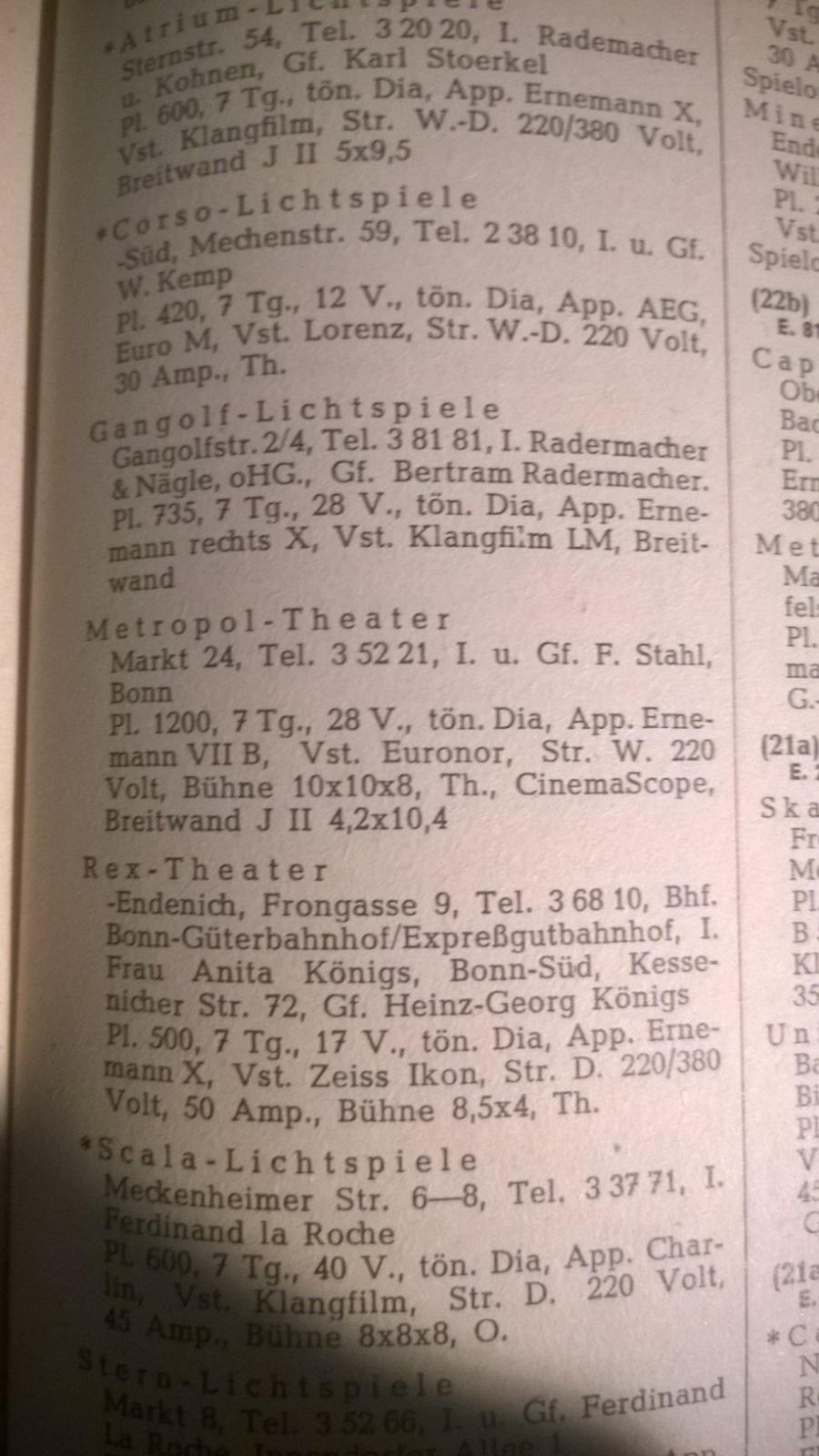 Welches Datum meinst du, Cinerama? Erbaut wurde das Metropol 1928/29, wobei die Planungen dafür wohl schon im Jahre 1926. Das spricht auch sehr für die starke Ausrichtung als Stummfilm- bzw. auch Variete-Theater. Die Wiedereröffnung für das Bonner Publikum nach dem Krieg war wohl 1949, wobbei es vorher wohl als Theater für die Besatzungstruppen genutzt wurde. Der erste, fatale, Teilabriss erfolgte 1986, die Wiedereröffnung des rekonstruierten Theaters 1990. Der Rest dürfte bekannt sein. Ich möchte nicht allzu pessimistisch sein, aber eine Wiederherstellung des Metropols halte ich leider für nahezu ausgeschlossen. Der Umbau zur Buchhandlung ist umfassender gewesen als er auf den hier gezeigten Bildern wirkt. Aus meiner, sehr laienhaften, statischen Sicht dürfte es durch Wandherausnahmen und Verlegungen, Entfernungen von Gebäudeteilen, etc. Schwierigkeiten bereiten den Urzustand wieder herzustellen. Des Weiteren dürfte, da das Nutzungskonzept Kino aufgehoben wurde, ein neu zu erstellender Fluchtwegeplan, durch weitere bauliche Veränderungen auch an den umliegenden Objekten, kaum mehr nach den heutigen Erfordernissen zu erstellen sein. Das Objekt hat in der Bonner Innenstadt eine 1A Lage. Selbst bei dem zu erwartenden Rückgang der Einzelhandelsfläche dürfte diese Lage eine immer stark begehrte sein, die finanzkräftige Nutzer anzieht. Möglich ist zum Beispiel, sollte Thalia mal wieder ausziehen, auch eine Zusammenlegung mit den beiden/oder einem Nebengebäude zu einer großen Verkaufsfläche. Der Besitzer ist, geschickter Weise, derselbe. Nicht zu Letzt, wer würde heute für ein Filmtheater noch so viel Geld in die Hand nehmen? Tragisch ist es sehr, das der Denkmalschutz anhand eines nicht korrekten Eintrages in die Liste aberkannt wurde. Erschreckend, dass nicht das Denkmal als solches über seinen kulturellen Wert entscheidet sondern ein formaler Eintrag. Das alte Metropol, vor 1986, war ein Traum - von der Vergoldung der Saaltüren, den Feuerschutzklappen im Vorführraum, der original Büroeinrichtungen, Kassenschildern, etc. gab es so viele erhaltene Details eines Theaters von 1929, dass für mich die Rekonstruktion von 1990, trotz der großen Liebe zum Detail, immer schon wie eine schleckte Reproduktion wirkte. Ich versuche mich gerade noch an die große, vor der Bühne gespannte Leinwand zu erinnern. Leider habe ich davon kein Foto mehr. Ich habe zwei Einträge aus den Filmtheater Adressbüchern von 1955 und 1961/62 angehängt. Vielleicht kann jemand damit etwas anfangen. Wobei ich denke, dass zumindest 1955 es noch nicht die später erlebte, große Leinwand gegeben hat. Meiner Erinnerung zur Folge wurde die Leinwand deutlich vor dem Bühnenrahmen gespannt und ging auch drüber hinaus. Das war wohl auch ein Grund, eine sehr große Leinwand aufzuspannen, ohne die Theaterbühne, welche auch bis zu Letzt immer noch genutzt wurde, nicht wie sonst oft für CinemaScope geschehen, umzubauen.