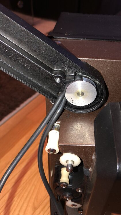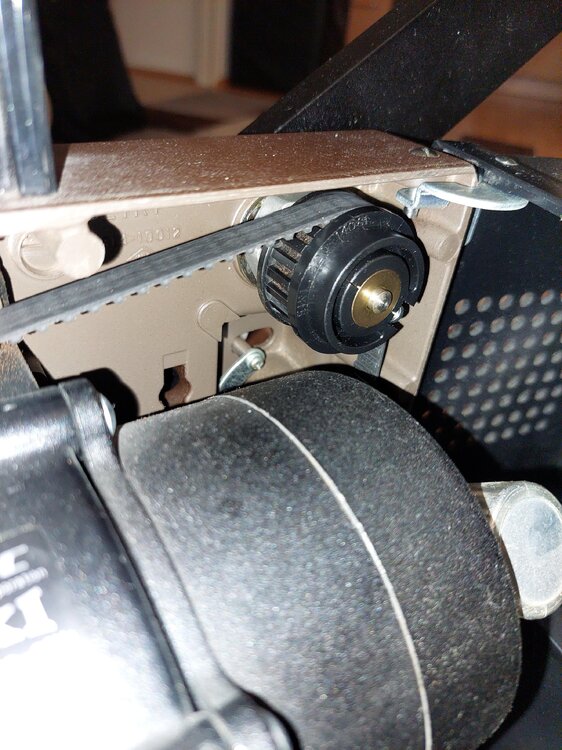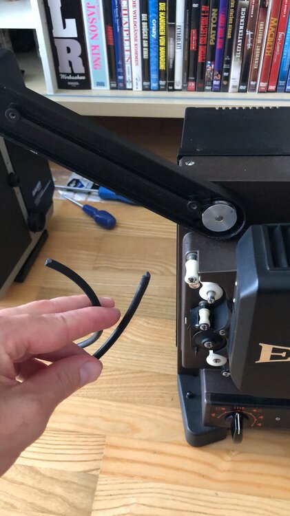 10. Vor ein paar Tagen, ist bei einer Vorführung der Riemen von der Rolle gesprungen und hat sich in der Führung verkeilt. (Siehe Fotos) Er war danach so stark beschädigt, dass er nicht mehr gerettet werden konnte. Anscheinend kann dies nur dann geschehen, wenn die Aufwickel-Friktion (=Rutschkupplung) im Gerät zu straff eingestellt ist. Das ergibt schöne feste Filmwicklungen auf der Aufwickelspule (bis zu "bretthart"). Aber es dehnt und stresst auch den Riemen enorm. Im Extremfall wird dann die eine Seite des Riemens -durch den übermäßigen Zug- so weit gedehnt, bis er eingezogen werden kann. Wie kann ich vor dem Einbau eines neuen Riemens die Friktion des hinteren Spulenarms auf einen niedrigeren Reibwert einstellen? Ich bin für jede Hilfe dankbar.