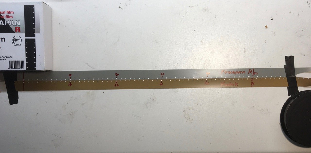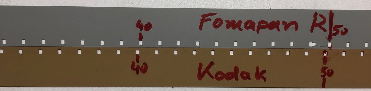 ich habe auch noch die Fotos gefunden, die die Perfo-Abweichung dokumentieren, wie die bei Foma genau zustande gekommen ist, kann ich nicht sagen. Jedenfalls ist das die Ursache für den Filmstau in der Kamera. Ich habe einen alten Kodak-Negativfilm daneben ausgelegt, um den Sollzustand der Perforation zu vergleichen und auch die betroffene Charge fotografiert. Beim 40. Perfoloch hat Foma den Kodak schon um 1 Perfobreite "überholt", somit muss es sich also weniger um eine Schrumpfung als vielmehr um eine Dehnung handeln ?