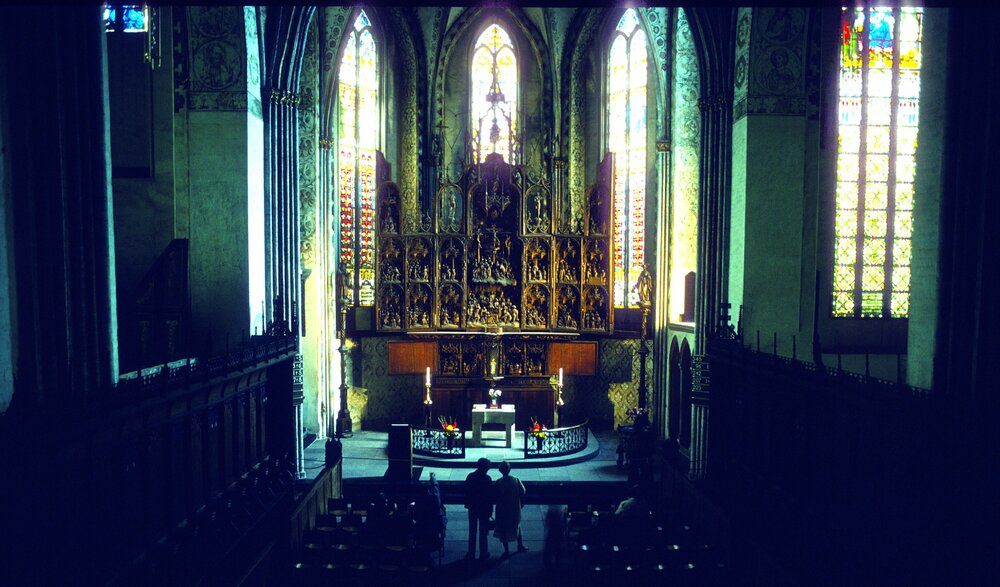 1992 drehten wir 2 kleine Kurzfilme im Schleswig Dom vom Bordesholmer Altar. Mit 392 Figuren und 12 m Höhe schon gewaltig. Um Niemanden zu stören und um unsere Lichtgestaltung beeinflussen zu können, bauten wir nachts ein Gerüst auf und drehten dann mit eigenem Licht. Kameras: ARRI 16 ST und ARRI 16 BL Film: 7297 Entwicklung und Kopien: Andec Ton: Nagra 4.2 und Mischung Konken KG Wir drehten erst nach fertiger Tonmischung Mittlerweile gescannt. Der erste Film: "Im Schatten des Leuchters" https://youtu.be/UMVNBhqzpWI