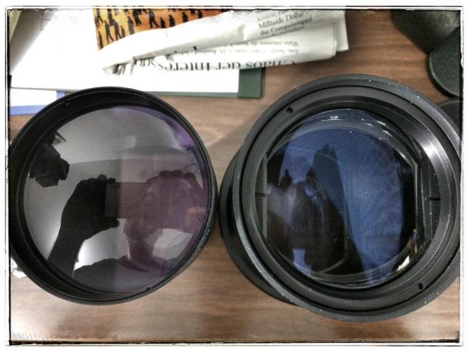 Ich hätte da eine Theorie... Da die Frontlinse des Objektivs(links) sehr groß ist, muss wohl auch der Anamorphot recht fett sein! :-) Rückseite des Anamorphoten(rechts)