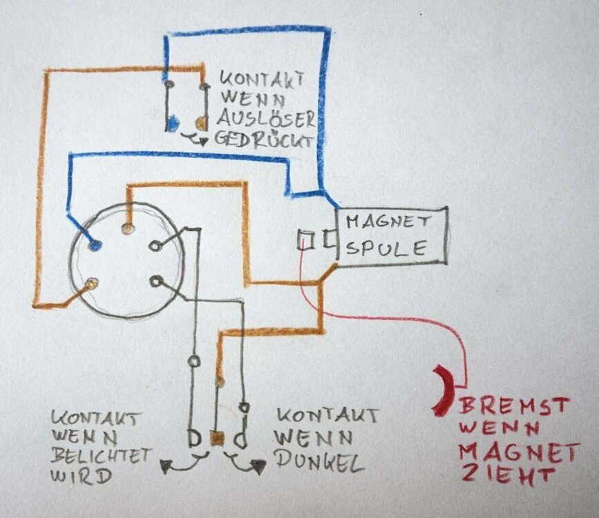 Wenn man den Auslöser Drückt, wird ein elektrischer Kontakt geschlossen und bleibt geschlossen, bis man wieder los läßt. Ein anderer elektrischer Kontakt ist immer in der Dunkelphase geschlossen. Während der Belichtung wird dieser Kontakt geöffnet und er schließt sich mit einem anderen Kabel. Hier gibt es also pro Bild einen Wechsel. Öffnen und schließen passieren nicht genau dann, wenn die Belichtung beginnt oder endet. Ob es noch einen Massekontakt gibt, der evtl. wichtig ist, kann ich nicht sagen. Kamera aus - kein elektr. Kontakt: Auslöser gedrückt - Kontakt geschlossen: Kontakt Dunkelphase: Kontakt Hellphase: Nochmal größer: Kontakt Dunkelphase: Kontakt Hellphase: Schaltplan: Woher die Geräte dann wissen, ob die Kamera zu schnell läuft und gebremst werden muß, ist mir allerdings nicht ganz klar. Vermutlich vergleicht der "Tonkoppler S", der am Tonbandgerät montiert ist, die durchgelaufene Tonband-länge mit der Bildfrequenz. Hat jemand einen solchen "Tonkoppler S"? Gibt´s daran eine Einrichtung, die die durchlaufenden Bandmeter zählt oder die Bandgeschwindigkeit mißt?