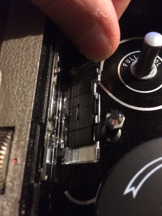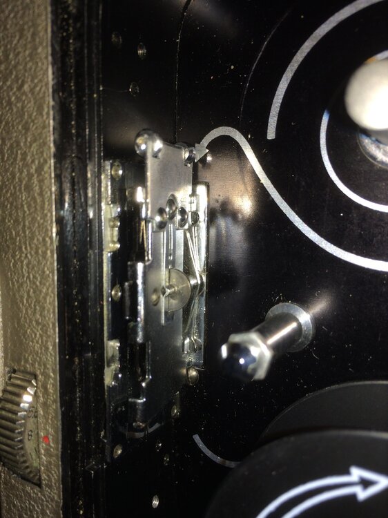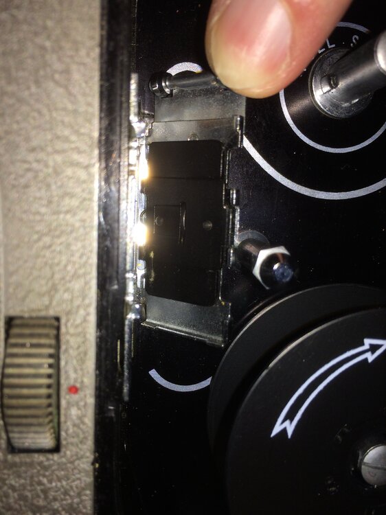 Eine Frage zur Cinemax 8 Triauto: Ich hab gerade etwas seltsames an der Kamera entdeckt. In der Andruckplatte ist ein Rädchen. Das drückt scheinbar genau neben dem Filmfenster, mittig auf den Film und läuft bei Transport mit. Gibts sowas öfter? Ich hab sowas noch nie gesehen. Welchen Sinn hat das? Die Kamera hat noch ein paar Besonderheiten: - Die Blende läßt sich komplett! schließen. So sind also u. U. Auf- und Abblendungen ohne Var. Sektorenblende möglich. - Die Bildfrequenzen sind stufenlos einstellbar - Sie hat eine TV-Bildfrequenz - zum Abfilmen von Fernsehröhren. Sehr praktisch! - Im Sucher sieht man mehr als den gefilmten Ausschnitt. Man ist also vorbereitet, wenn jemand in´s Bild läuft. - Der Revolver hat, wenn man ihn im Uhrzeigersinn dreht, eine Stop-Funktion nach dem dritten Objektiv. Ich weiß nicht genau wozu, aber vielleicht um eine bestimmte Brennweite zu finden, ohne hinschauen zu müssen. Z.B. das Weitwinkel um eine Szene mit einer Totalen beginnen zu lassen. - Sie hat einen interessanten Zubehörschuh am Filmfachdeckel, für den es aber scheinbar leider kein Zubehör gibt.