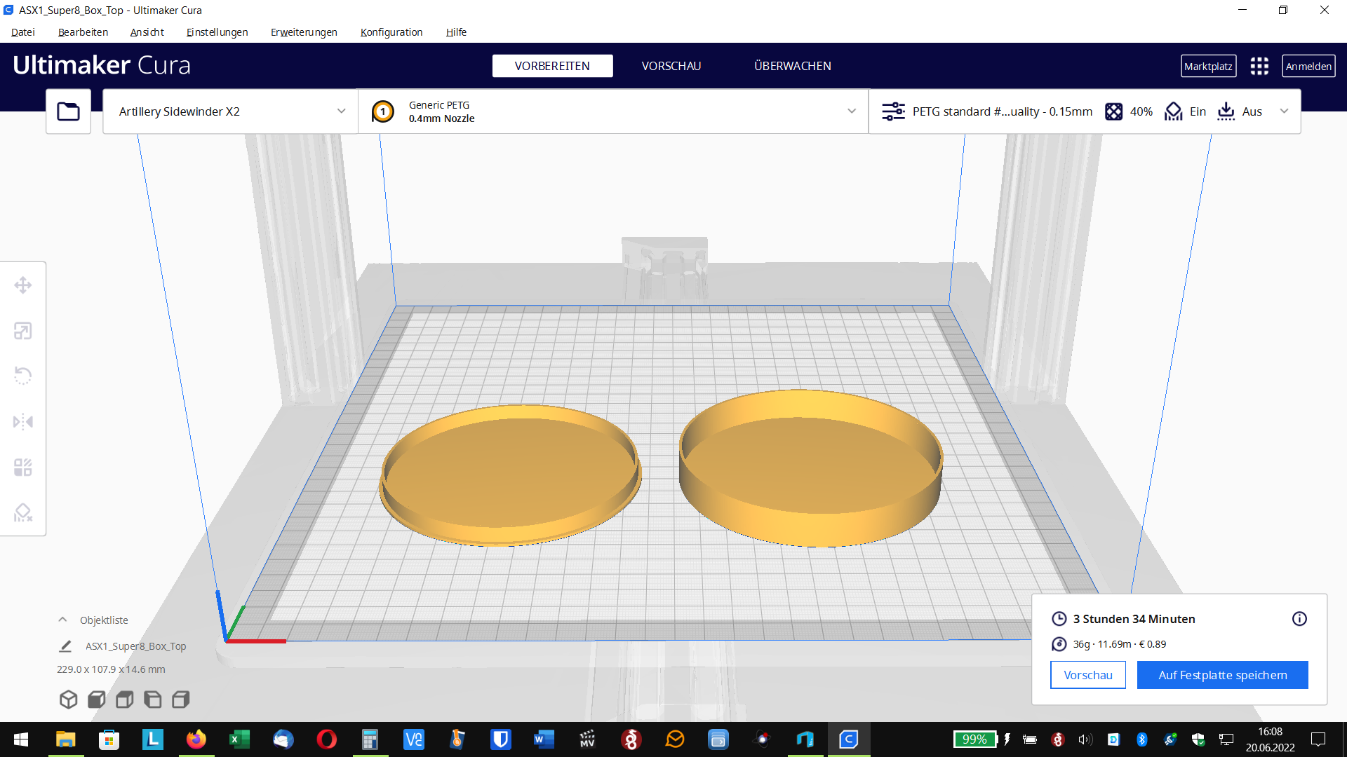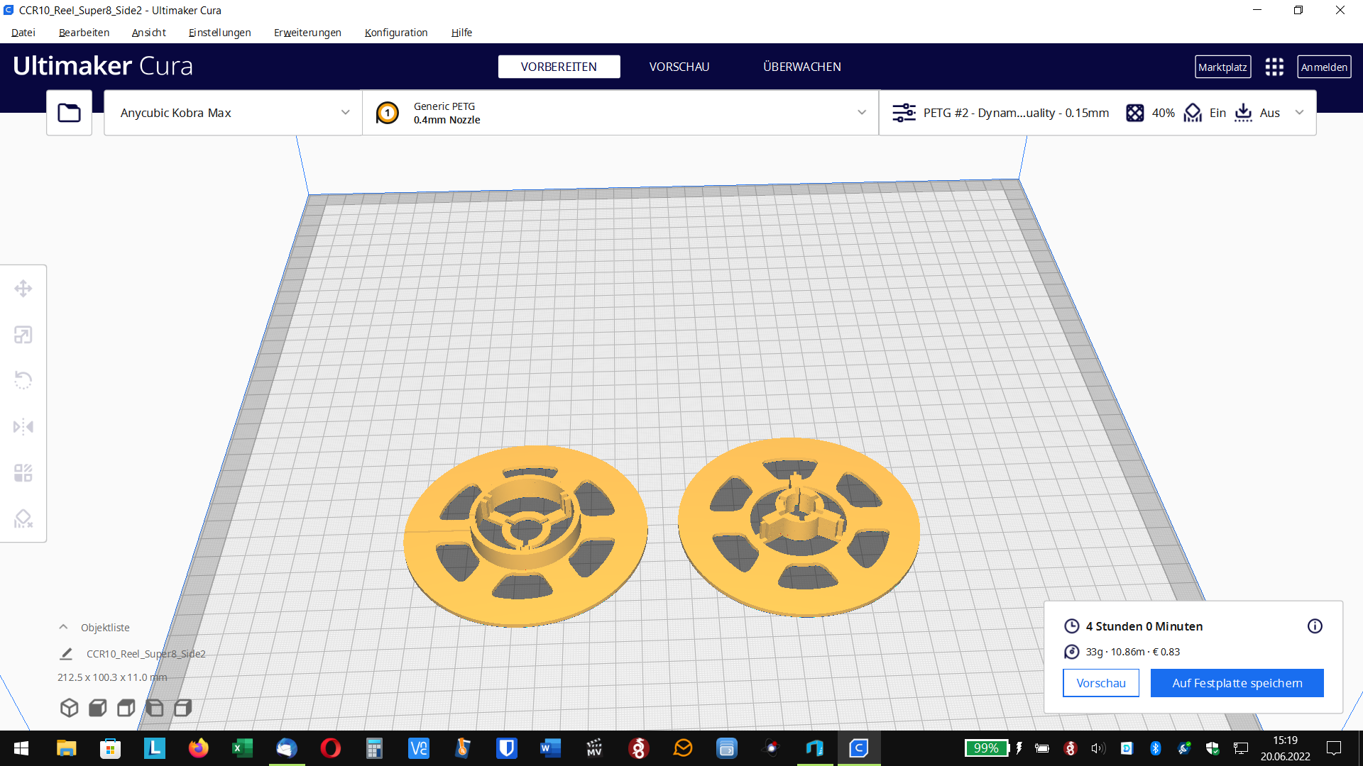 Also die 30m Dose dauert bei mir (nur eine Dose pro Arbeitsgang momentan) 3:24h Druckzeit bei 90 Cent Filametkosten und ca. 36g Filament. Nutze PETG zu ca. 22 Euro pro kg.