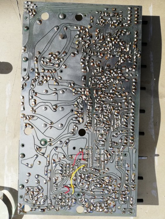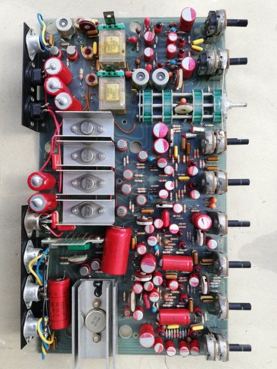 Hallo Zusammen, auf Nachfrage eines Forenmitgliedes, möchte ich hier nochmals eine kleine Arbeitsanweisung erstellen, wie man den kompletten Verstärker aus dem Heuertier Stereo 42 ausbaut. Ich hatte dies vor längerer Zeit gemacht und bin nicht mehr ganz sicher, ob ich nichts vergessen habe. Korrigiert mich bitte. Ich wollte meinen Projektor, nachdem er perfekt läuft nicht nochmals zerlegen. 1. Sämtliche Bedienknöpfe der unteren Reihe abziehen - geht mitunter etwas schwer - Tuch benutzen. Achtung der Knopf für die Spurlage ist mit einer kleinen Gewindestift gesichert und ist mehrteilig - nichts verlieren. 2. Zunächst fünf Schrauben lösen und seitliche Abdeckung abnehmen. 3. Knopf für die Höhenverstellung des Projektors ganz herausdrehen. Der verstellbare Fuß kann dann nach unten entnommen werden. Anschließend die Umlaufende Blechummantelung abnehmen. 4. Unter bzw. hinter der Schwungmasse befinden sich zwei Relais, die über grüne Stecker mit dem Oberteil des Projektors verbunden sind. Bevor diese Stecker nach oben abgezogen werden können, müssen von vorne zwei kleine Sicherungschräubchen entfernt werden. 5. Zwischen der Bodenplate des Projektors und dem Verstärkergehäuse befindet sich ein Luftspalt (ca. 3 mm) Durch diesen Luftspalt kommt man mit einem dünnen Schraubendreher von vorne an die Sicherungschrauben der grünen Stecker aus Pkt. 4 heran. (Auf dem Bild ist das umlaufende graue Blech noch dran, das muss natürlich weg.) 6. Den Projektor vorsichtig auf die Seite legen (polstern). Danach die sechs Schlitzschrauben auf der Unterseite lösen. Danach lässt die das komplette Verstärkerteil schräg nach unten anheben. Achtung: Das Verstärkerteil ist über viele Einzelleitungen mit dem Projektor verbunden. Diese Leitungen sind gesteckt und können leicht abgezogen werden - aber Vorsicht. Einige Farben kommen mehrmals vor und können leicht verwechselt werden. Also alle Leitungspositionen gut kennzeichnen. Wenn alle Verbindungen gelöst sind, kann der Verstäker vollends nach unten abgenommen werden. Bitte vorsichtig sein beim Ausfädeln der Potiachsen für die Bedienknöpfe. Die Verstärkerplatine ist mit einigen Schrauben im Verstärkergehäuse befestigt. Nach Lösen der Schrauben kann die Platine entommen werden und ist dann beidseitig zugänglich. Viel Erfolg, Liebe Grüße, Andreas