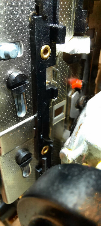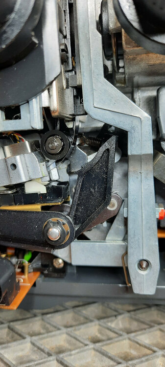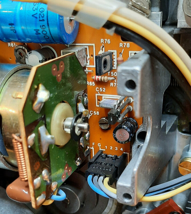 Hallo Zusammen, ich meine jetzt den Fehler gefunden und behoben zu haben: Auf dem unteren Bild meines letzten Threads mit dem weißen Vorspannstreifen sieht man, dass die Greiferzähne ganz an der Perforation zur Mitte hin anliegen. Über zwei gefederte Andruckstücke wird der Filmstreifen gegen die vernietete schwarze Führung gedrückt. Vermutlich ist diese etwas verschlissen, so dass der Filmstreifen jetzt im Verhältnis zum Greifer zu weit außen läuft. Nach Lösen der zwei schwarzen Schrauben, kann man die Platte verstellen. wie man sieht ist die aber schon am Anschlag. Also habe ich den Greifer ganz behutsam minimal versucht nach außen zu biegen. Jetzt läuft der Film absolut ruhig durch und die Schlaufe ist immer vorhanden. Die Freude hielt jedoch nicht lange an. Beim Zurückspulen gab der Motor plötzlich Vollgas. Jetzt läuft der Projektor nur noch im Turbo-Modus. 😔 Heißt jetzt: Motorreglerplatine auf Fehler überprüfen. Möglicherweise wurde ein Bauteil durch den kurzgeschlossenen Kondensator vorgeschädigt. Es geht also wieder weiter - packe ich's an.💪 Liebe Grüße